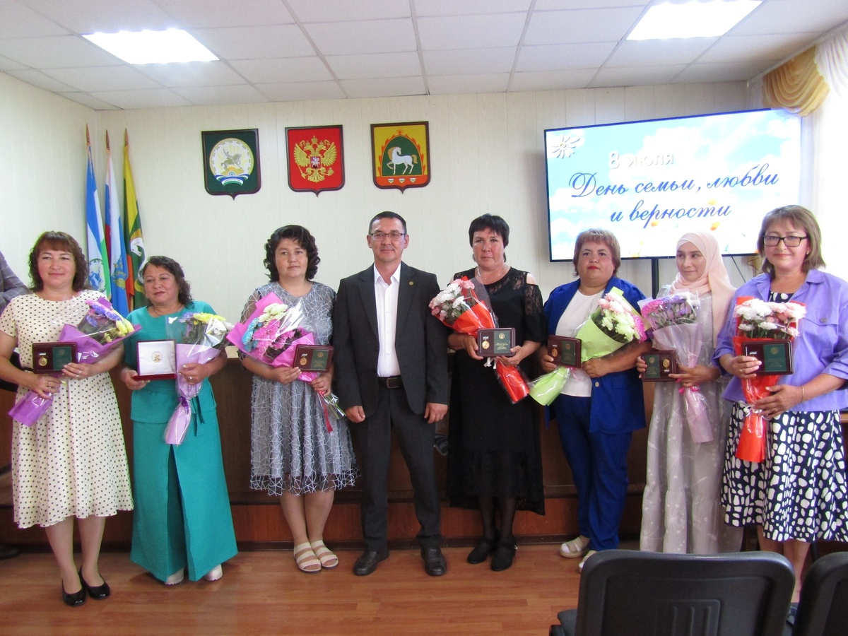 В День семьи, любви и верности награды получили семь женщин На торжественном мероприятии заместитель главы района по социальной и кадровой политике Фаниль Надыргулов выразил благодарность и признательность многодетным матерям. Он отметил, что их путь труден, но прекрасен. В обществе их уважают, а государство поддерживает в приоритетном порядке. К мамам обратилась и председатель районного женсовета Гульшат Байдавлетова. Она пожелала им достойно воспитать детей. Поздравляем наших землячек с присвоением столь почетной награды! Желаем им здоровья, успехов и сил.