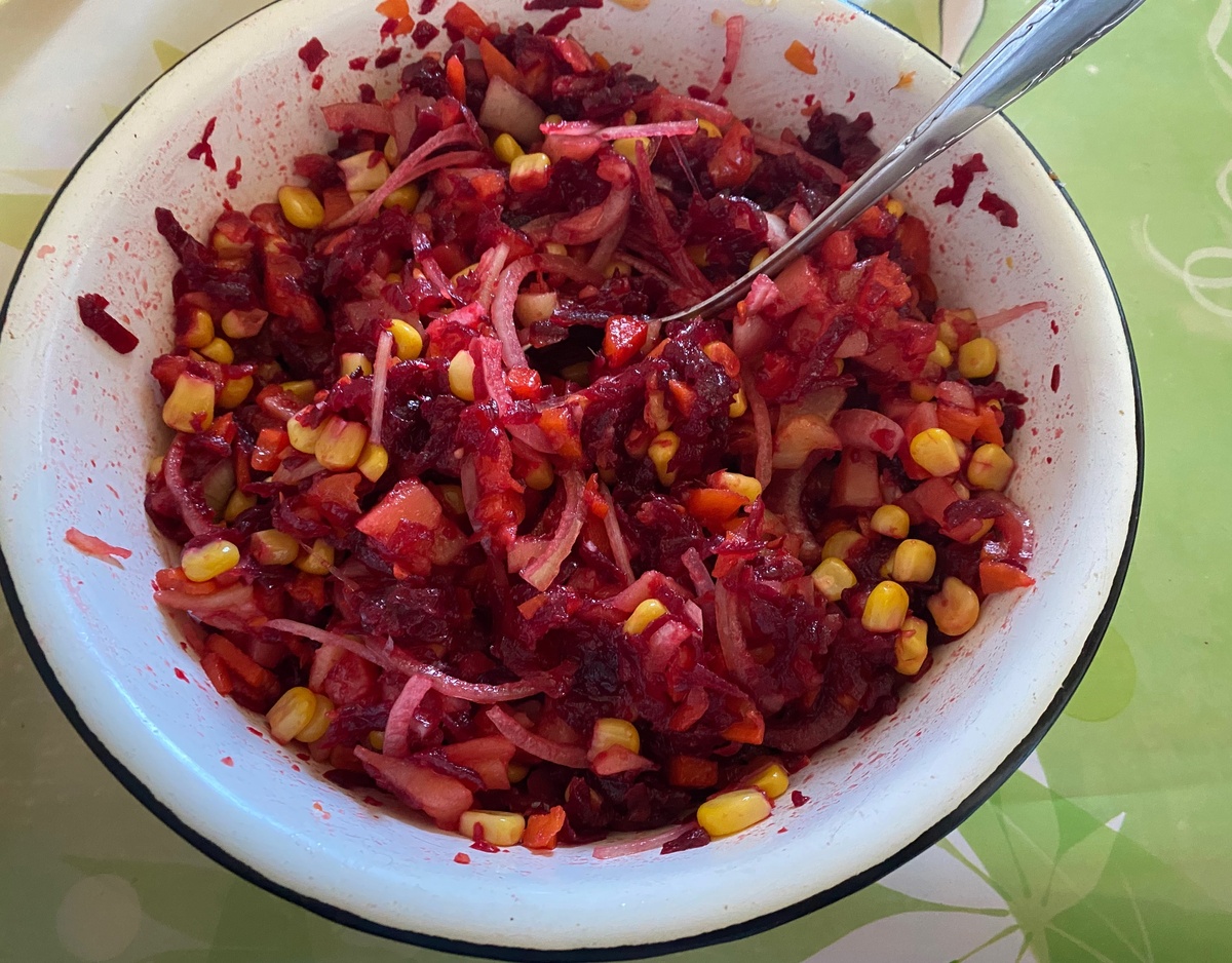 Легкий салат, который чем-то напоминает винегрет. Время приготовления: 15 минут. Свеклу, морковь и картофель предварительно отвариваем. Свеклу натираем на крупной терке. Добавляем растительное масло и все перемешиваем. После нарезаем половину луковицы полукольцами. Мелко нарезаем морковь и соединяем ее с луком. К имеющимся ингредиентам присоединяем нарезанный картофель. Слив воду из баночки, добавляем в глубокую тарелку кукурузу. Последний штрих — добавляем натертую свеклу, чайную ложку яблочного уксуса и все перемешиваем. Готово! Автор рецепта: antosha62