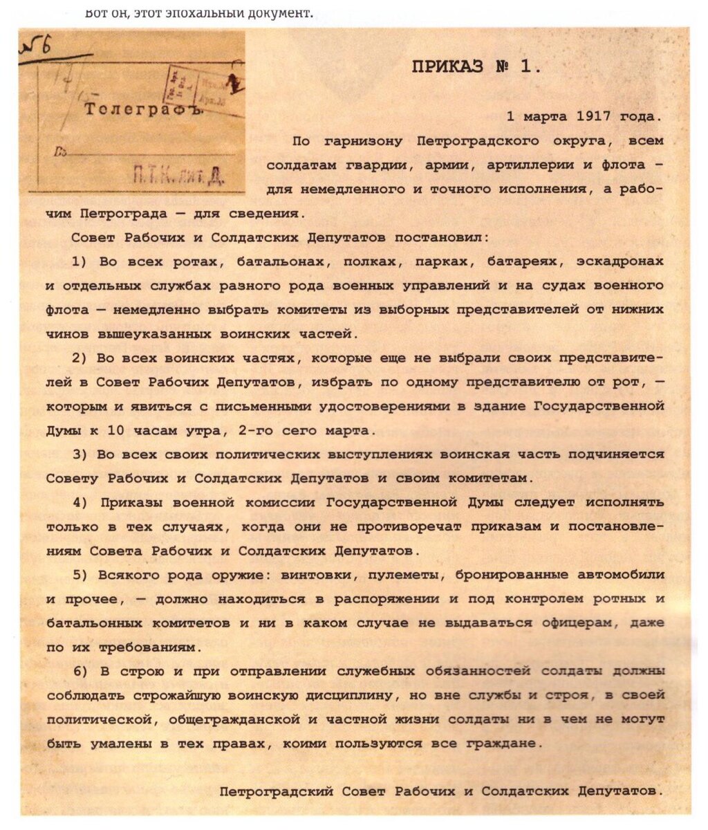 Пока в Пскове разыгрывалась драма отречения, в Петрограде солдаты и обыватели расхватывали утренний выпуск «Известий Петроградского Совета Рабочих и Солдатских Депутатов» с пресловутым «Приказом № 1».