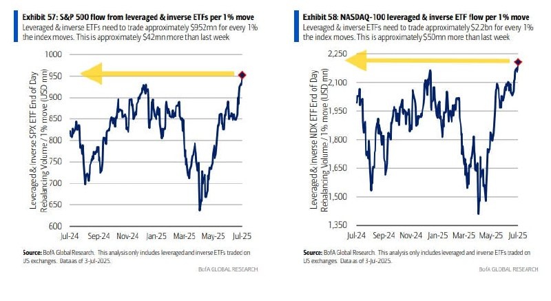 Про казинофикацию фондового рыночка: Leveraged ETFs [с кредитным плечом] — барометр risk-on безумия. Обращаем внимание: позиции LETFs по SPX и NDX на прошлой неделе продолжили расти, достигнув самого высокого уровня с 2023-го. В мейнстрим СМИ-помойках продолжают делать вид, что все нормально: «ETF с кредитным плечом доминировали в диком квартале» [Barrons] 2x Coinbase ETF, который использует кредитное плечо для увеличения своей доли в криптовалютной бирже Coinbase Global, вырос на 233% за три месяца, в то время как более прозаичный Vanguard S&P 500 ETF (VOO) стоимостью 1,4 триллиона долларов прибавил всего 10,9% Трейдеры Уолл-стрит приняли аббревиатуру TACO (Trump Always Chickens Out), чтобы играть на этом феномене. Покупайте после того, как он объявляет о тарифе, и рынок падает, продавайте после того, как рынок восстанавливается, когда он отступает. Rinse and repeat. P.S. Никто на самом деле не ждет и не готов к обвалу. Ну может только читатели канала.. @marketheart