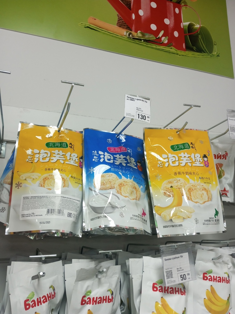 Начну сразу с той новинки, ради которой и хотела заглянуть в магазин. Вот такие китайские сладости, представленные в двух вкусах: йогурт и банан. У нас они стоят 130 рублей, хотя во многих других городах дешевле, по 99, хотя и в том, и в другом случае это не самая низкая цена, внутри десерты в индивидуальных упаковках и их 7 штук (по описанию это хрустящее печенье и кремовая начинка).