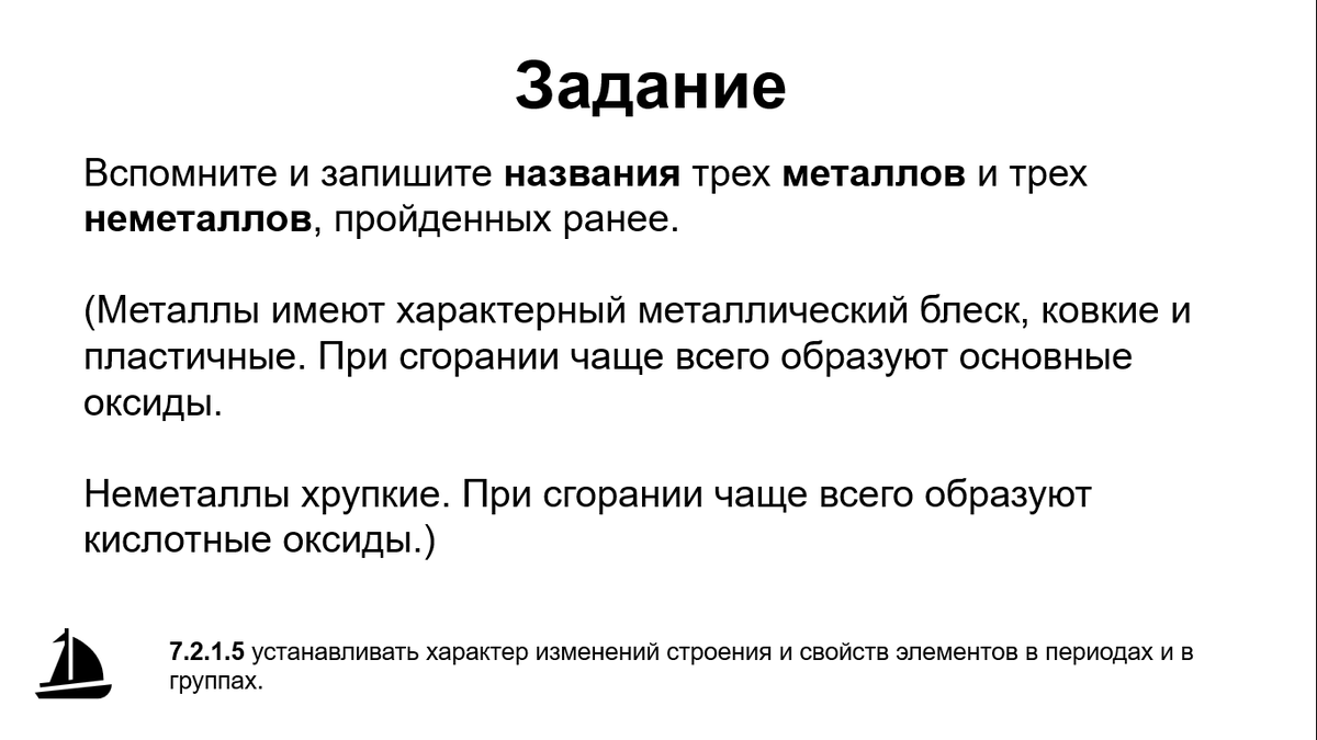 Вы уже знаете о существовании металлов и неметаллов. Давайте немного вспомним о них. Ранее мы рассматривали металлы и неметаллы при образовании кислотных и основных оксидов при сжигании. Причем при сжигании металлов образовывались основные оксиды, а при сжигании неметаллов - кислотные оксиды. Металлы обладают такими свойствами, как металлический блеск, ковкость и пластичность. По этим признакам мы легко могли выделить металлы из знакомых простых веществ. Неметаллы же обладают противоположными свойствами: они хрупкие. Выполните задание! Проверьте себя. Это список металлов и неметаллов, которые мы рассматривали ранее, но он неполон. Металлов и неметаллов гораздо больше. Найдите эти или названные Вами химические элементы в Периодической Системе Химических элементов и сформулируйте ответ на следующий вопрос. Используем длиннопериодную таблицу. Проанализировав нахождение металлов и неметаллов в Периодической Системе Химических Элементов можно прийти к выводу, что металлы располагаются ближе