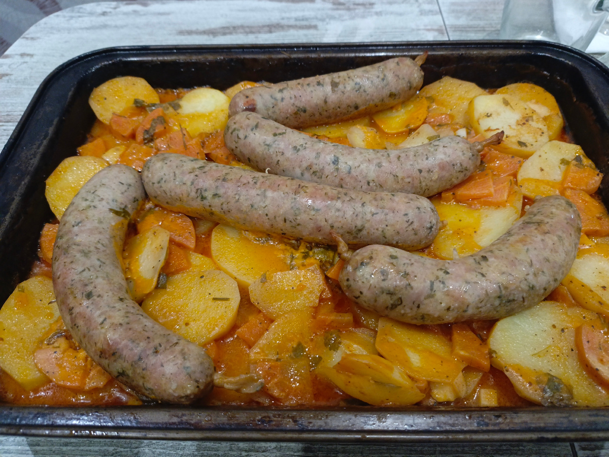 Нам понадобится Картофель помыть, почистить и нарезать слайсами по 5 мм. Морковь и лук нарезать и все поместить в посуду. Соль перец по вкусу. Добавить нарезанный чеснок и зелень. По столовой ложке майонеза и томатной пасты. Все перемешать, накрыть крышкой и оставить мариноваться на час Далее на противень ровным слоем укладываем картофель и заливаем соком образовавшимся после маринования Сверху укладываем купаты, в моём случае это домашние купаты собственного производства. Накрываем фольгой. В заранее разогретую духовку 200° на час. Очень вкусно получается! Приятного аппетита!