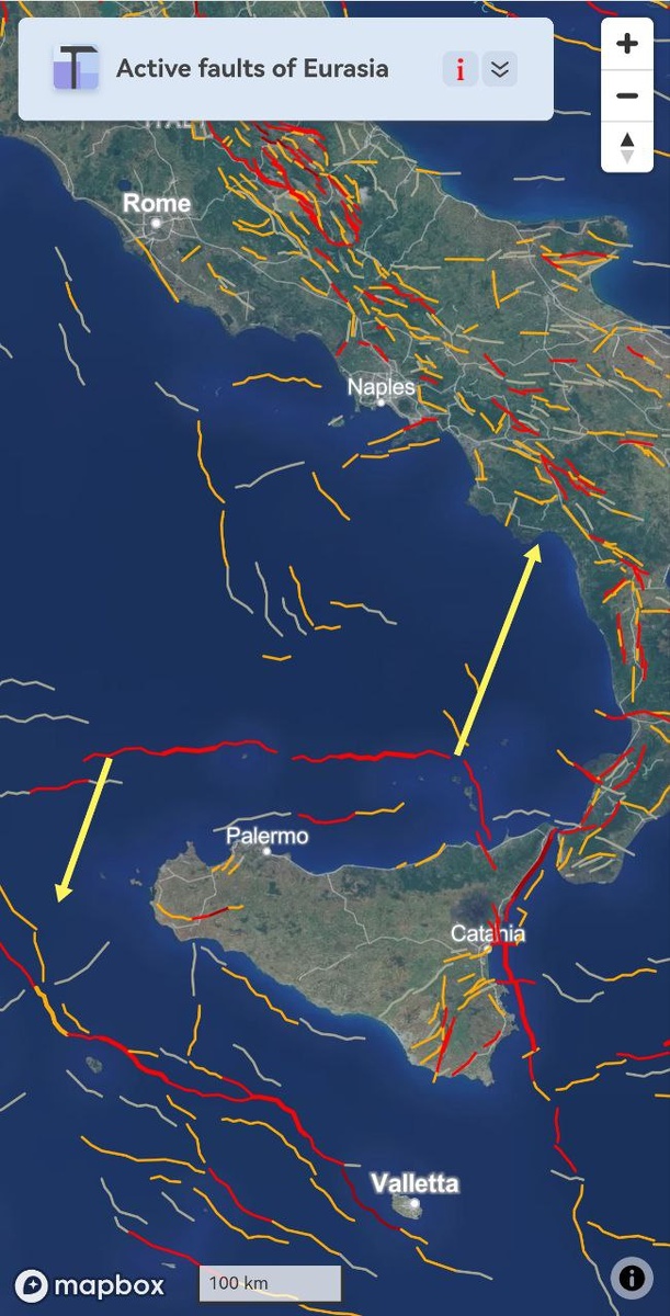 Есть вероятность землетрясения М4.5-5+ между Сицилией и Неаполем в течение 7 дней. P.S. либо вулканы: Этна или Стромболи "помогут". ==== There is a possibility of an M4.5-5+ earthquake between Sicily and Naples within 7 days
