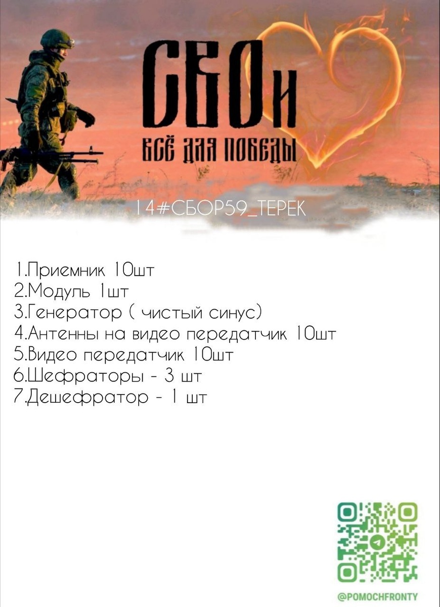 1️⃣4️⃣ Июль-Августовский сбор📌 🥰🥹😌🥹☺️ Разведка, Запорожье👁🗝 Подразделение МАЗАЯ Нужна связь и энергия для выживания разведгруппы. Необходимо: 1. 📻 Приемники × 10 2. 📦 Модуль × 1 3. ⚡ Генератор (чистый синус!) 4. 📡 Антенны для передатчика × 10 5. 🔌 Видеопередатчики × 10 6. Шифраторы × 3 + Дешифратор × 1 (спецоборудование, ссылок нет) → Без генератора — нет связи с командованием. → Без передатчиков — разведка слепнет. → Шифраторы — единственная защита от прослушки. Их позицию знает враг. Каждый час без оборудования — смертельный риск. #Терек #Мазай #Разведка #ЗапорожскийФронт Группа Мазая ждёт. Мы их последняя надежда.