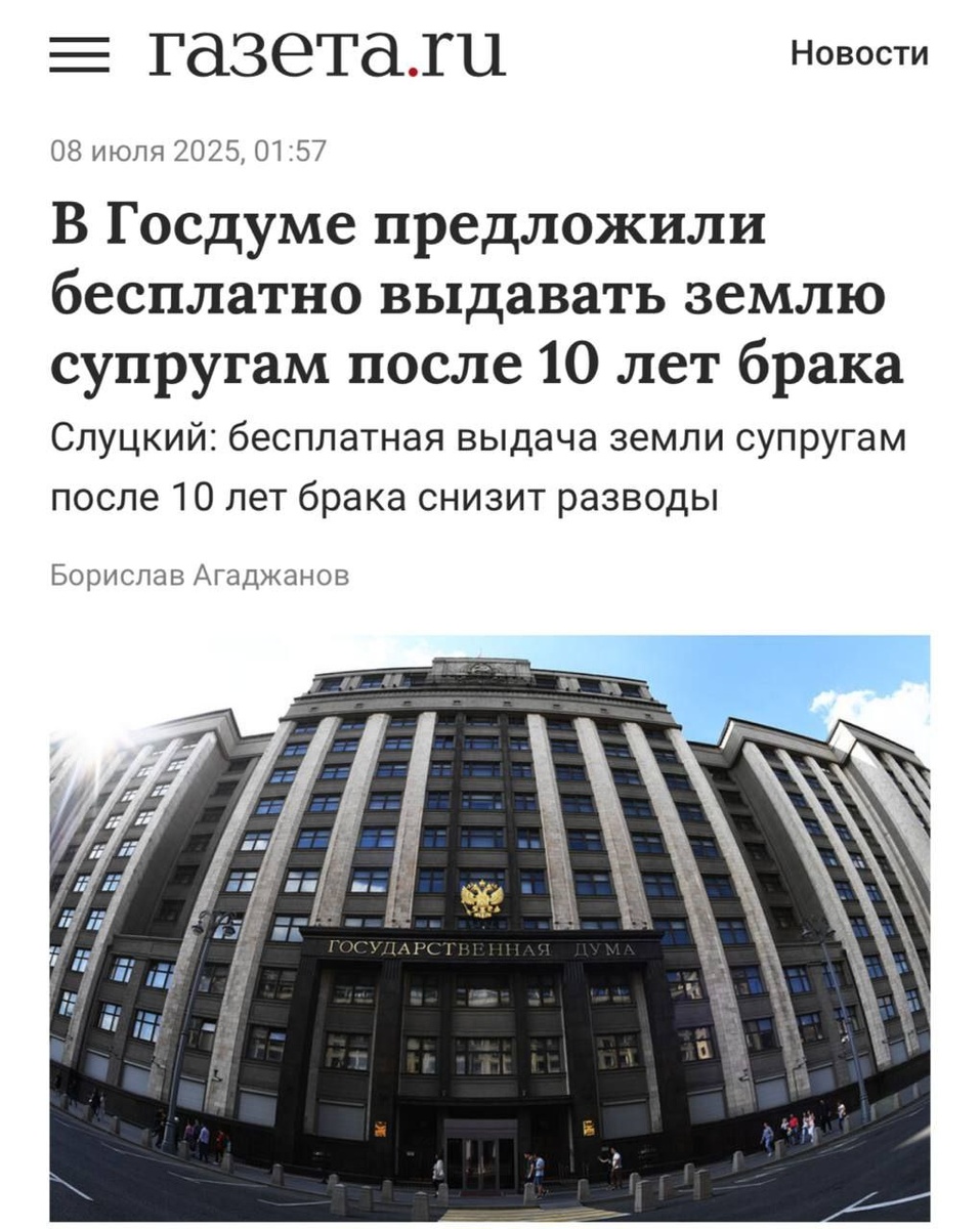 В России хотят выдавать БЕСПЛАТНЫЕ участки парам после 10 лет брака — законопроект уже направили в правительство. Главное условие: в семье должен быть хотя бы один ребенок. С помощью этой инициативы депутаты надеются снизить уровень разводов. При этом участок будет предоставляться в том же регионе, где живёт семья. Нужно продержаться 10 лет.