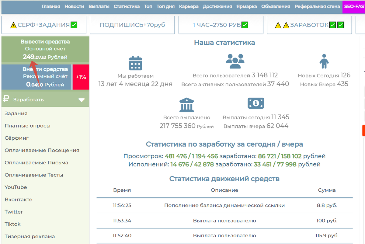 Заработок на просмотре сайтов и видео ютуб, рутуб. Начать зарабатывать очень просто. После регистрации в разделе "заработать", выбираем способ заработка. "Серфинг", это просмотр сайтов рекламодателей, за посещение которых нам платят деньги на баланс. Посмотреть сервис. А в разделе "ютуб" можно просматривать видео (ютуб и рутуб ролики). За них мы так же получаем деньги на баланс, которые можно выводить на электронные кошельки, либо на карту, кому как удобнее. Видео обзор сервиса: