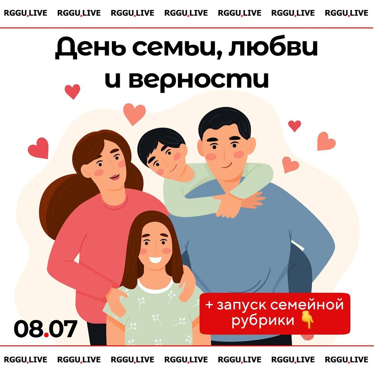 ❤️ Семья — наша опора! 👨👩👧👦 Сегодня, 8 июля, отмечают День семьи, любви и верности, который напоминает нам о самых важных ценностях в жизни, ведь семья — это поддержка и источник вдохновения 🎉 Команда RGGU.LIVE поздравляет тебя с этим праздником и предлагает принять участие в акции! ✔️ Тема: «Активные каникулы всей семьёй» 🔴 Сделай креативную фотографию с семьёй; 🔴 Подпиши своё имя, фамилию, курс и факультет; 🔴 Отправь её в наш чат-бот обратной связи @rggulive_news_bot до 18:00 9 июля ➡️ Итоги акции будут подведены 10 июля в общем посте со всеми фотографиями 👆 Скорее готовь камеру и участвуй! ✍️ Дария Лисова, 1 курс ФЖ 🎨 Анна Штеленко, 1 курс ИФ ⚪ Подписывайся на RGGU.LIVE #РГГУ #СтудентРГГУ #семьи_в_науке #СтуденческаяСемья2025