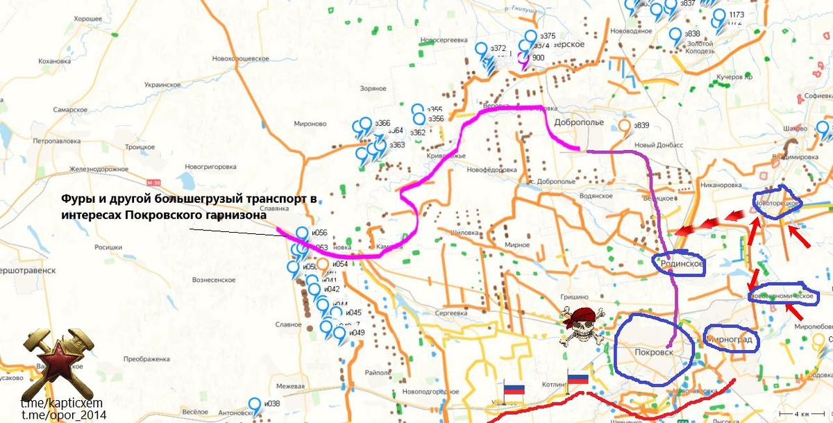 В ответ на пост И укроинфобомонд дождался, но со знаком "минус". ВС РФ в очень тяжелых боях окончательно погасили стратегическую активность противника на западном охвате Покровска (см.схему из цитирования), и сами потихоньку перешли к активным действиям под Удачным. Но основное действие происходит на восточном фланге "Покровской дуги". Кратко по голубым оборонительным узлам: Новоэкономическое - клещи. Новоторецкое - атаки с двух направлений. Эти два населенных пункта входят в оборонительную систему, которую наши сейчас добивают (см.прошлые статьи) И цель движения - Родинское. Фиолетовая линия - это маршрут крупнотоннажного транспорта в Покровск. Все остальные маршруты перекрыты. И понятно стремление нашего Генштаба придавить эту подачу кислорода. Ну а после взятия, блокирования, окружения Родинского, начнется подготовка к генеральному штурму Покровска У ВСУ остается одна дорога смерти с запада , там еще и мосты порушены, вообщем очень кисло, значок черепушки там не спроста. Схему взял