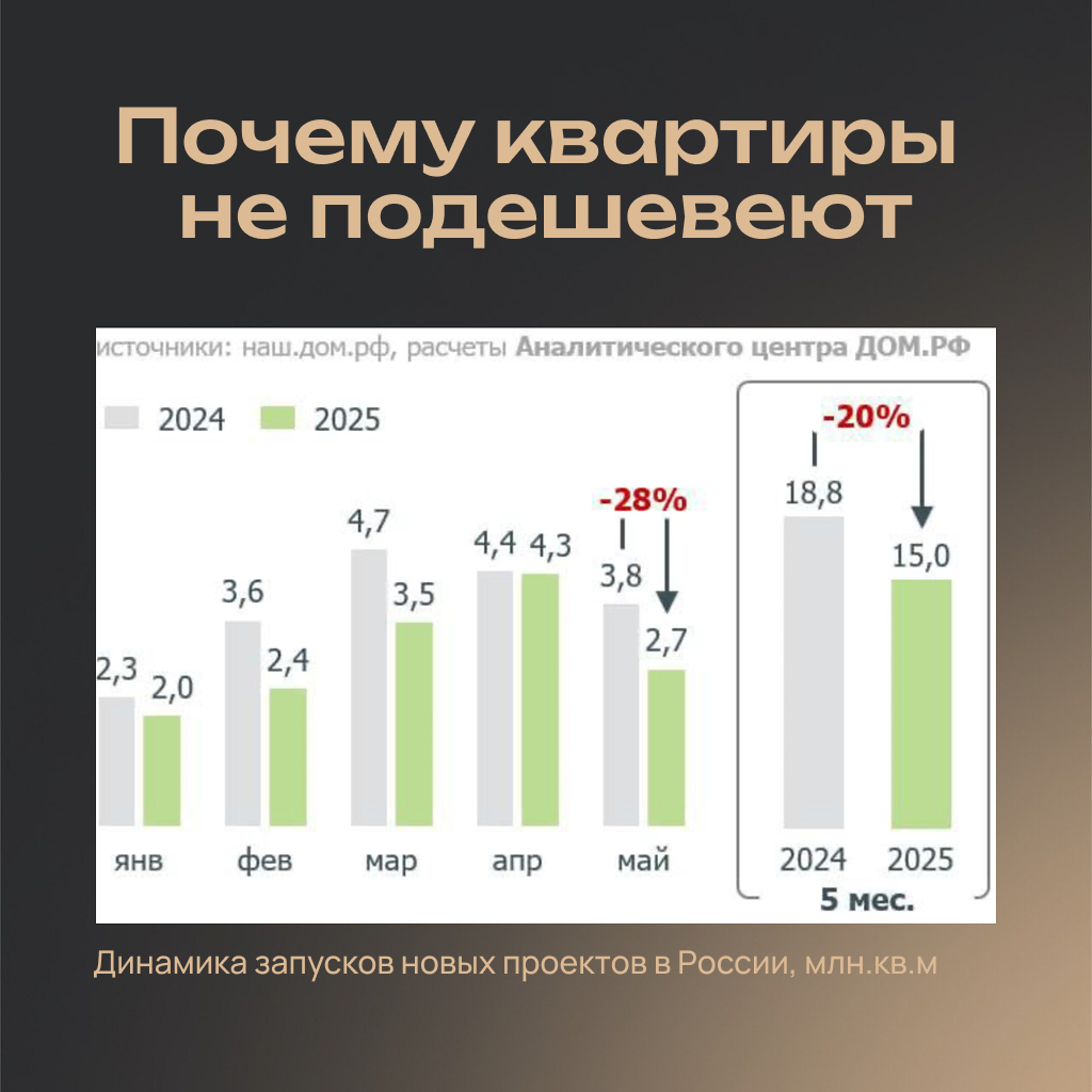 Причина всему вклады: чем больше вкладов у россиян, тем дороже будут квартиры Да, не разобравшись в ситуации, может показаться странным то, что от суммы вкладов зависит увеличение стоимости будущих квартир, поэтому давайте разбираться: На вкладах граждан сейчас Х денег (около 75,9 трлн ₽, если быть точнее) ➡️ за первые 5 месяцев 2025 года видна сильная отрицательная динамика запусков новых проектов в сравнении с тем же периодом 2024 года (см. график на фото) ➡️ как только высокие ставки по вкладам закончатся, люди начнут забирать деньги из банков и вкладываться в недвижимость, где предложение будет сильно ограничено Еще раз, логика следующая: скоро спроса будет сильно больше предложения, а это значит только одно — неизбежное увеличение цены «А почему бы девелоперам не начать строить больше объектов, чтобы не допустить роста цен?» Согласны, это было бы самым простым решением)) Но в действительности девелоперы не могут увеличивать строительство из-за слабого спроса, финансовых ограничен