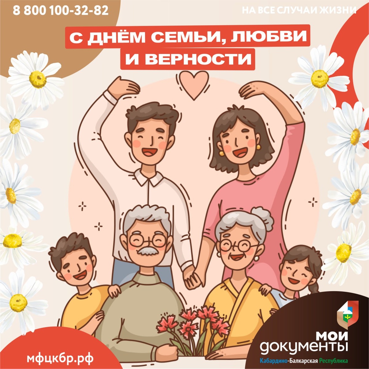 💜От всего коллектива МФЦ КБР сердечно поздравляем вас с Днём семьи, любви и верности! 💜 Этот прекрасный праздник напоминает нам о самых важных ценностях в жизни – крепкой семье, искренней любви и верности, которые, как и ромашка, стали его символом. Желаем вам тепла и взаимопонимания в доме, радости от каждого дня, проведённого вместе, и благополучия, которое начинается с любви и заботы близких. Пусть ваши семьи будут надёжной опорой, а в сердцах всегда живёт гармония и счастье! Есть вопрос? Пишите ✏️ 🤎 #МФЦКБР #МФЦ #МоиДокументы #Госуслуги #СоцПоддержка ✈️Подпишись и будь в курсе новостей | Мы в ВКонтакте