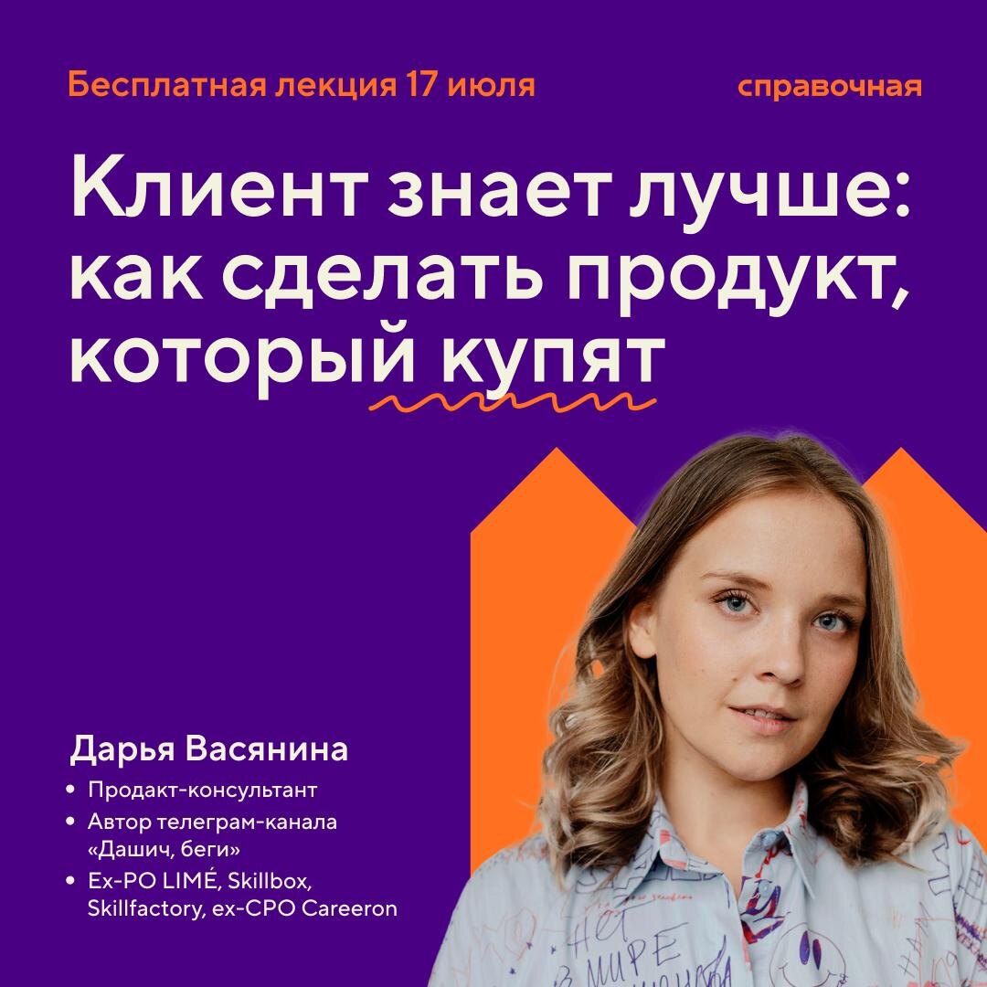 🔈 Как сделать продукт, который купят? Бизнес растёт быстрее, когда вы знаете свою аудиторию. Лучше понимать, кто ваши клиенты, чего они хотят и зачем покупают, помогают исследования. ➡️ Как собирать эти данные и, главное, как их применять на практике, обсудим 17 июля в 11:00 мск вместе с Дашей Васяниной — продакт-консультантом и автором телеграм-канала «Дашич, беги», ex-PO Lime, ex-CPO Careeron. В прямом эфире Даша расскажет: 🔘 что такое глубинные интервью и как их проводить; 🔘 какие вопросы задавать клиенту, чтобы понять его по-настоящему; 🔘 как с помощью исследований проверить идеи до запуска и не потратить деньги зря; 🔘 как адаптировать продукт и маркетинг под конкретные боли аудитории. Зарегистрироваться на лекцию можно через бота Справочной. Он напомнит о встрече, пришлёт запись, а также подарки от Точка Банк и Даши. До встречи! 🔥 @spravochnaya🔥