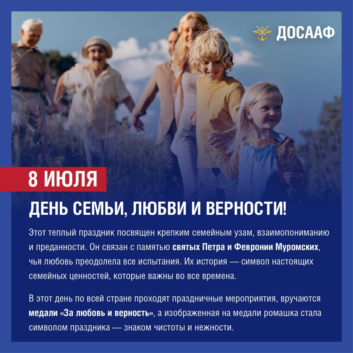 8 июля — День семьи, любви и верности! Этот теплый праздник посвящен крепким семейным узам, взаимопониманию и преданности. Он связан с памятью святых Петра и Февронии Муромских, чья любовь преодолела все испытания. Их история — символ настоящих семейных ценностей, которые важны во все времена. В этот день по всей стране проходят праздничные мероприятия, вручаются медали «За любовь и верность», а изображенная на медали ромашка стала символом праздника — знаком чистоты и нежности. Семья — это основа общества, опора для каждого человека. В ДОСААФ России мы понимаем, как важно поддерживать семейные традиции, воспитывать молодежь в духе уважения к старшим и заботы о близких. Крепкая семья дает силы для достижений в учебе, спорте и профессии, формирует надежный тыл для защитников Отечества. Берегите своих близких, цените каждое мгновение, проведенное вместе, и пусть ваша любовь будет такой же крепкой, как у Петра и Февронии! Подписывайтесь на Telegram-канал «ДОСААФ России» #ДОСААФ #День