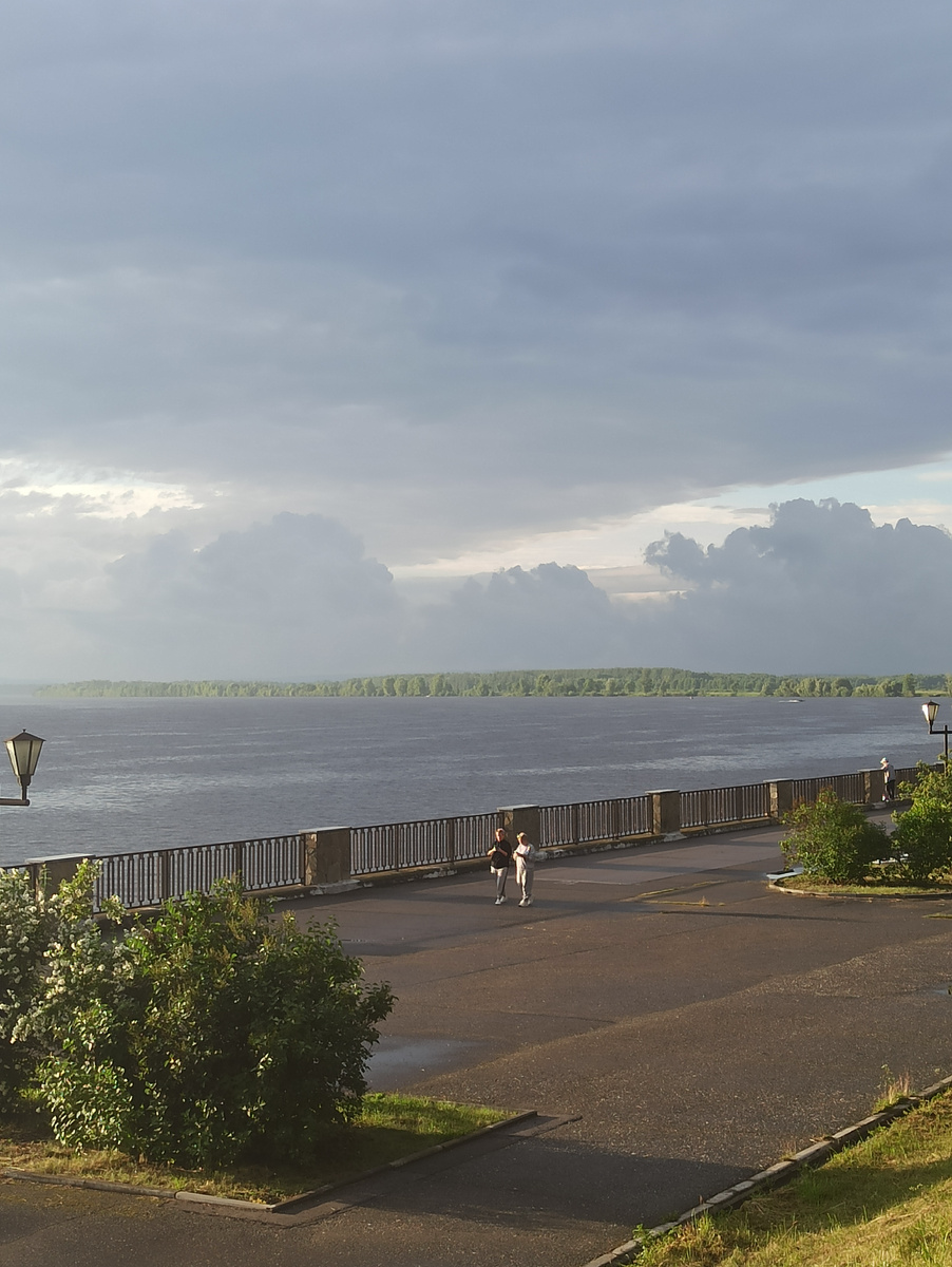 И должна сказать, утренние прогулки и пробежки здесь - обычное дело. Люди выходят на них с 6 утра. Я гуляла каждое утро до завтрака. И встречалась примерно с одними и теми же людьми утром на набережной или в холле корпуса. Маршрут очень простой - выходишь из "Камы", проходишь между "Камой" и "Уральским" к набережной, иногда поднимаешься на смотровую площадку, а чаще спускаешься ближе к реке и проходишь до самого пляжа. Затем сворачиваешь через летнее кафе к бальнеолечебнице и идёшь по центральной аллее обратно к своему корпусу. По времени такая прогулка занимала у меня полчаса. По ощущениям - отличный заряд бодрости на день. Успеваешь и полюбоваться утренней природой, и подумать о жизни, и пообщаться с персоналом курорта (а в это время уже кипит работа во всю, наводится порядок на дорожках и газонах).