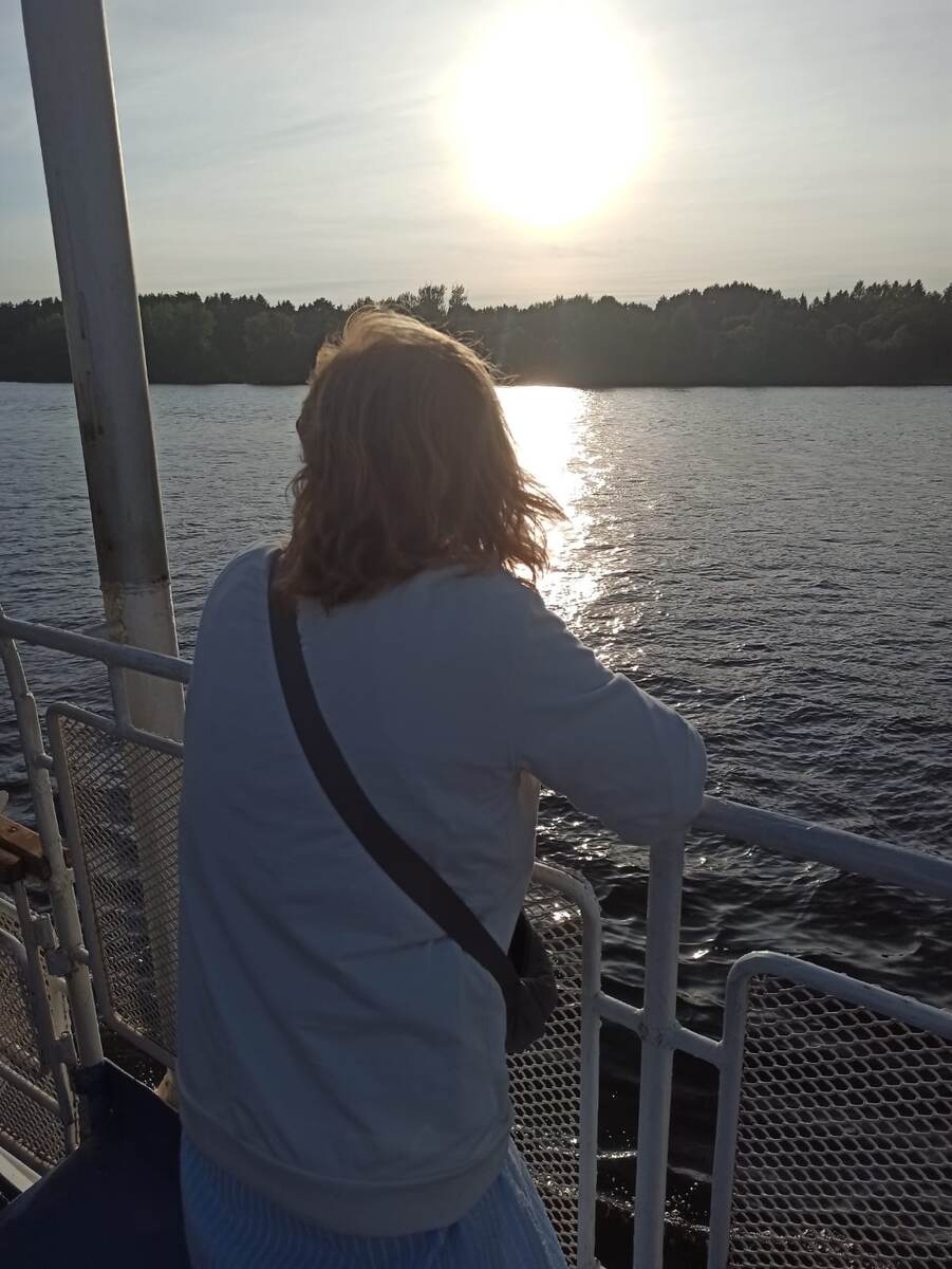 А почему я это знаю об этом? А потому что мы катались на небольшом теплоходике по Каме. Отъезжает он два раза в день от причала на набережной за КПП. По времени катает полтора часа, в 16 часов - вправо от курорта, в сторону Перми, в 20 часов - влево, до Вятских островов. И в процессе женщина, принимающая оплату за экскурсию и выдающая пледы желающим (а на воде всегда холоднее и ветренее, чем на берегу), много рассказывала о Каме и о том, что мы видим по пути. В том числе и о том, где лучше купаться.