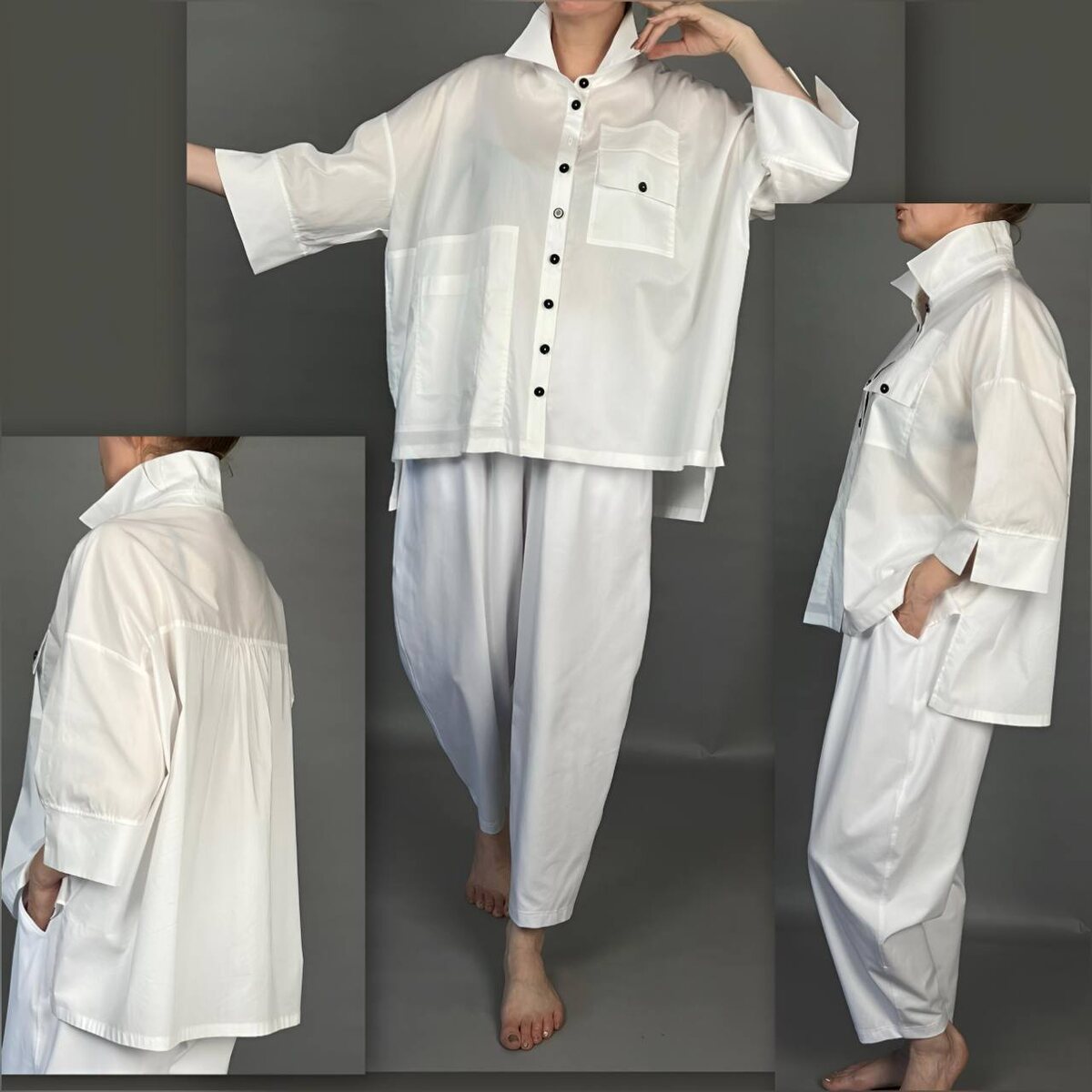 Устали менять рубашки? Нужна ОДНА на ВСЁ? Белый поплин — ваш герой! Волшебный силуэт с двумя стильными карманами. Под любые ваши брюки — классика, кюлоты, джинс! Рубашка в размере 52-56. 9 900 ₽. Все брюки в едином размере. Бананы и брюки галифе 52–54, 9 900 ₽. Купить 👉 @LeraSamaryanova или WhatsApp +7(917)517-58-17.