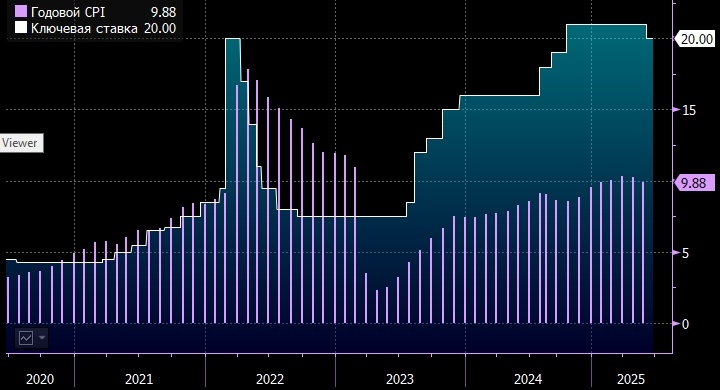 Все сильнее звучат аргументы в пользу более быстрого смягчения денежно-кредитной политики Банк ПСБ понизил прогноз ключевой ставки ЦБ РФ на конец текущего года с 18% до 16% годовых, сообщается в материале аналитика Дениса Попова. "Несмотря на ускорение роста промышленности экономика продолжает остывать. Вероятно, это происходит за счет подавленного внутреннего спроса, о чем также свидетельствует замедление инфляции с опережением ожиданий Банка России. Пока мы не видим оснований для изменения своего прогноза динамики реального ВВП в 2025 году (+1,5%). При этом все сильнее аргументы для более быстрого смягчения денежно-кредитной политики. Прогноз ключевой ставки на конец 2025 года снижаем с 18% до 16% годовых", - указывает эксперт. Настоящее сообщение содержит мнение специалистов инвестиционной компании или банка, полученное Интерфаксом. Такое мнение предоставляется исключительно для целей ознакомления и не является рекомендацией для покупки, продажи ценных бумаг, принятия (или неприняти