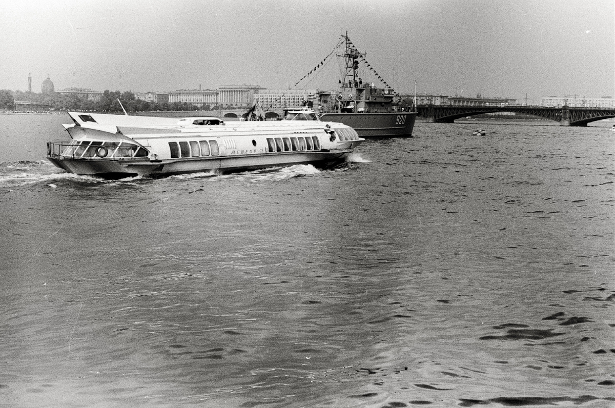 Я оцифровал фотоплёнку из домашнего архива с фотографиями парада кораблей в честь дня советского Военно-морского флота в Ленинграде в 1975-м году. На фотографиях присутствуют как военные, так и гражданские суда. После просмотра этой публикации можете найти в интернете выпуск «Ленинградской кинохроники» за август 1975-го года. Параду по случаю дня ВМФ там посвящено почти три минуты. Спереди плывёт скоростной теплоход на подводных крыльях «Метеор». За ним виден базовый тральщик с номером 920. Тральщик с предыдущей фотографии. Речной пассажирский теплоход «Нева-1». Насколько я знаю, он используется до сих пор. Сторожевой корабль «Бодрый». В девяностые годы он будет расформирован. Речной пассажирский теплоход «Нева-6». На этой фотографии ему чуть больше года. Он работает по назначению по сей день. Подводная лодка. Катер РК-1117 серии «Ярославец». Эскадренный миноносец «Степенный». Недолго ему осталось: в 1986-м году он будет расформирован. У меня есть три плёнки с фотографиями этого пара