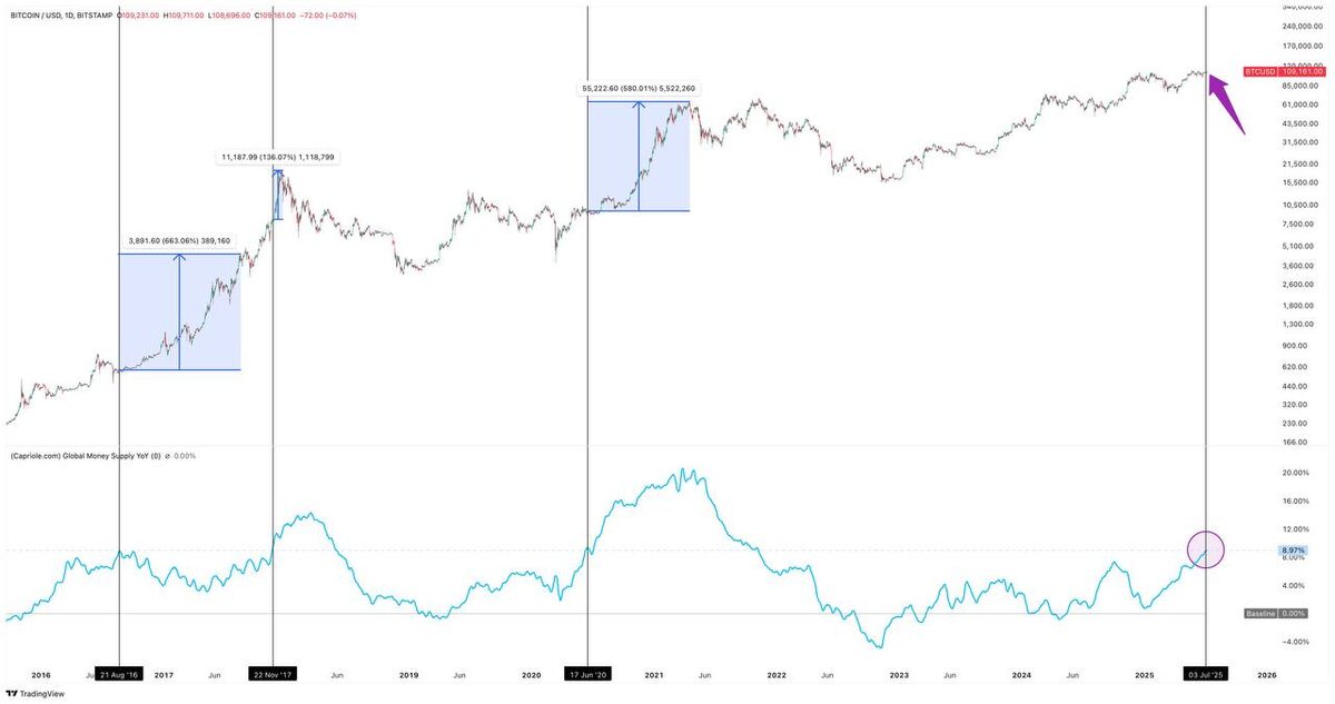 Деньги снова печатают. И Биткоин это чувствует. Глобальная денежная масса (M2) растёт на 9% год к году. Это много. В исторической перспективе — экстремально много. Уже в этом году мы с вами можем купить на 9% меньше товаров и услуг на ту же сумму в фиате. Как вам такое? Capriole предоставили данные: — В 2016 году, после старта печатного цикла — Биткоин вырос на 663% — В 2020 — на 580% — Сейчас — рост только начинается. Пока все гадают, будет ли коррекция с $110k до $90k, крупные игроки смотрят не на цену, а на потоки ликвидности. Деньги снова дешевеют, система заливается фиатом, и Биткоин, как всегда, реагирует одним из первых. Именно поэтому мы разбирали в прошлом посте: сначала растёт золото, потом — медь, потом — нефть. А Биткоин — впереди всех. Печатают? Печатают. Деньги бегут в активы, которые невозможно размножить. Добро пожаловать в цикл. Если хотите — могу сделать отдельный пост по глобальной M2, и как она влияет на рынки, особенно на BTC. Ставьте 🔥 — разберём с приме