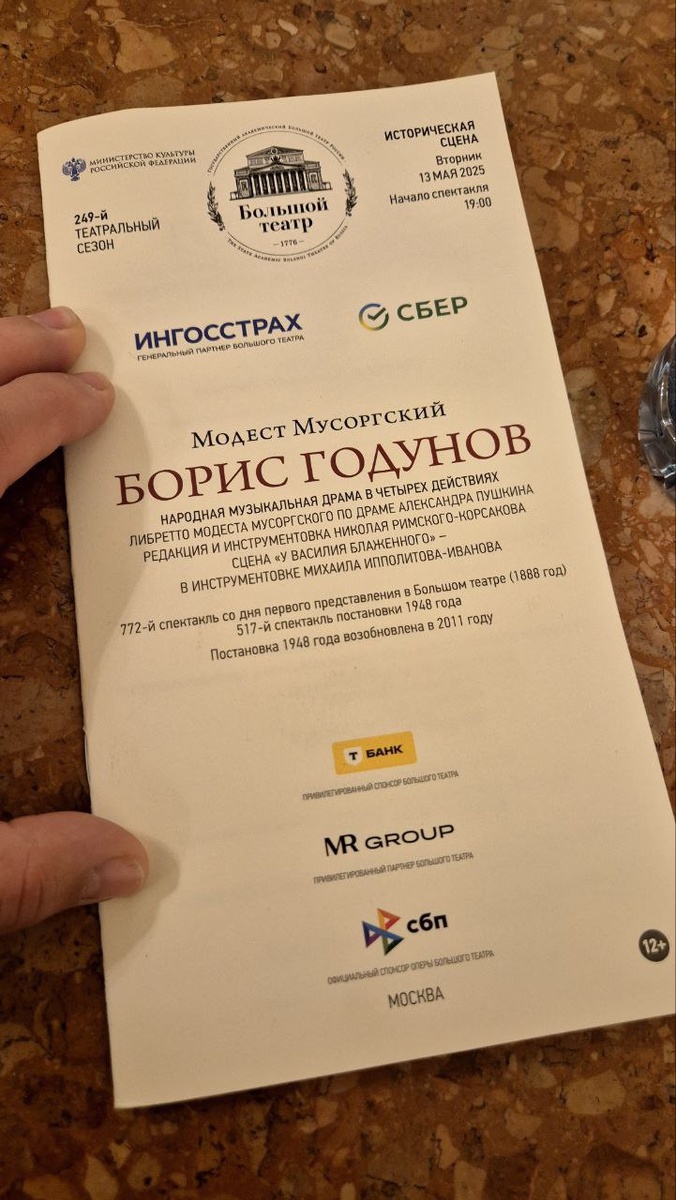 «Борис Годунов» — опера в Большом театре. Впервые я сидела на первом ряду. Такой выбор мы сделали, исходя из того, что цены на билеты были одинаковые по всему партеру — 10 000 рублей. Мы с подругой решили сесть поближе и рассмотреть всё в мельчайших подробностях. Отзывы обещали эпическое и красивое зрелище. Всё оказалось именно таким. Я под огромным впечатлением. Расскажу один эпизод, чтобы, прежде всего, выполнить обещание Саше. Она ушла раньше, спектакль длился четыре с половиной часа, и это было главным испытанием. Но, видимо, сейчас я в таком состоянии терпения и любопытства, что, несмотря на желание спать (ложусь рано), смотрела с огромным удовольствием. Чтобы вы могли почувствовать всю масштабность и зрелищность, расскажу лишь об одном эпизоде. Народ бунтует. На сцене примерно сто человек (позже число увеличилось до ста пятидесяти). Толпа огромная, каждый одет индивидуально, ни одного повторяющегося костюма. Простые зипуны разных цветов — от спокойных зелёных и коричневых о