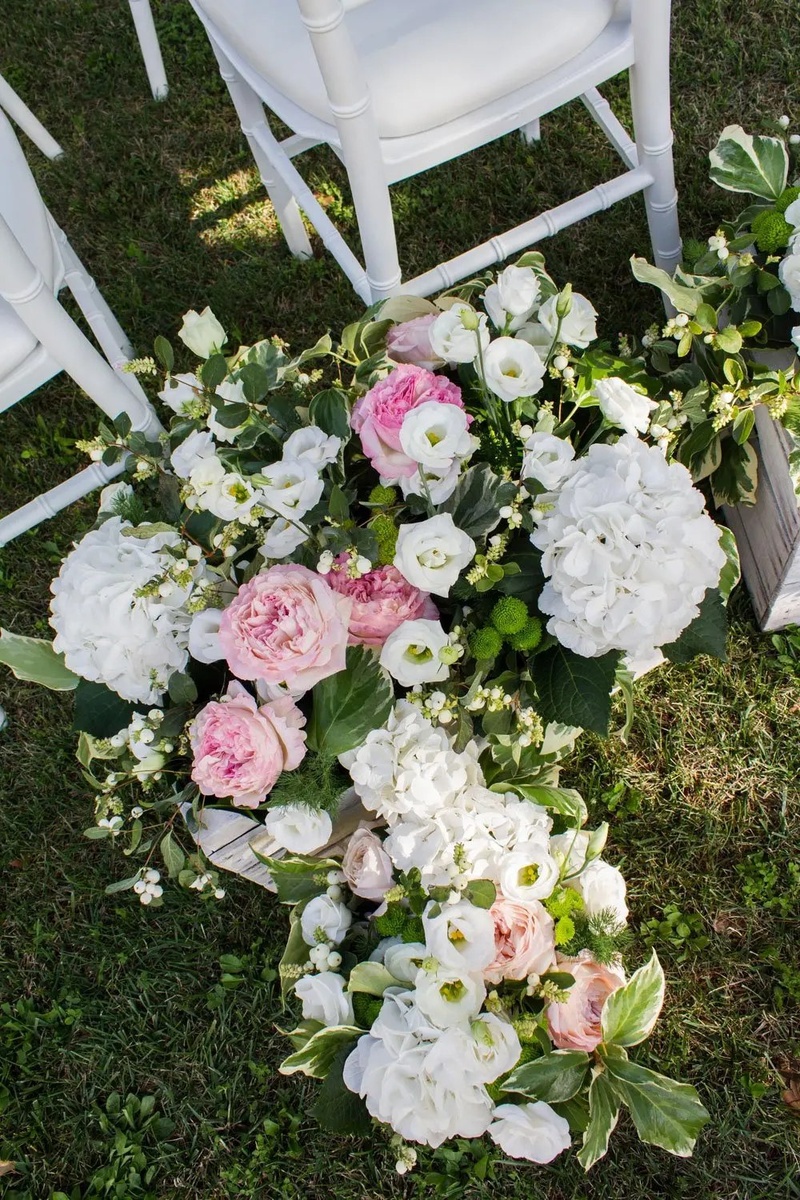 Свадебная композиция для выездной регистрации: гортензии, розы и эустома в зелёном обрамлении