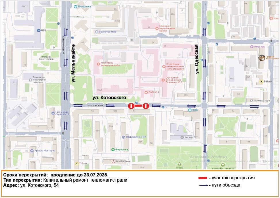 В связи с производственной необходимостью при капитальном ремонте тепловой сети сроки прекращения движения транспортных средств на автомобильной дороге ул. Котовского в районе дома № 54 продлеваются до 23.07.2025. Участников дорожного движения просим обращать внимание на знаки, заранее планировать маршрут, соблюдать Правила дорожного движения РФ. Возможные маршруты объезда: ул. Одесская, ул. Мельникайте, ул. Республики, ул. 50 лет Октября.