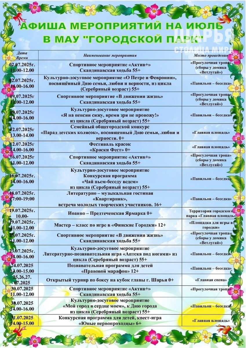 Оба мероприятия проведут в июле В Шарье пройдут два традиционных масштабных праздника. Для жителей и гостей города подготовили спортивные и творческие активности. Фото: группа ВК «Шарья — столица мира» 19-го июля в костромской райцентр приедут мастера из разных муниципалитетов и регионов на Иоанно-Предтеченскую ярмарку. Праздник проведут в местном парке. Для посетителей организуют творческие мастер-классы, конкурсы и музыкальные выступления. На территории зоны отдыха развернется торговля деревянными, берестяными и кожевенными изделиями. Гости праздника смогут полакомиться фирменной медовухой и другими гастрономическими угощениями. Интересный факт: фестиваль проводится в Шарье с 2014-го года С 26 по 27 июля в Городском парке пройдет Открытый турнир по боксу на Кубок главы Шарьи. В состязаниях примут участие спортсмены из Межевского района, Шарьи, Кировской и Ивановской областей, а также из Костромы. До 31-го июля в Шарье запланированы и другие развлекательные мероприятия. Среди них квес