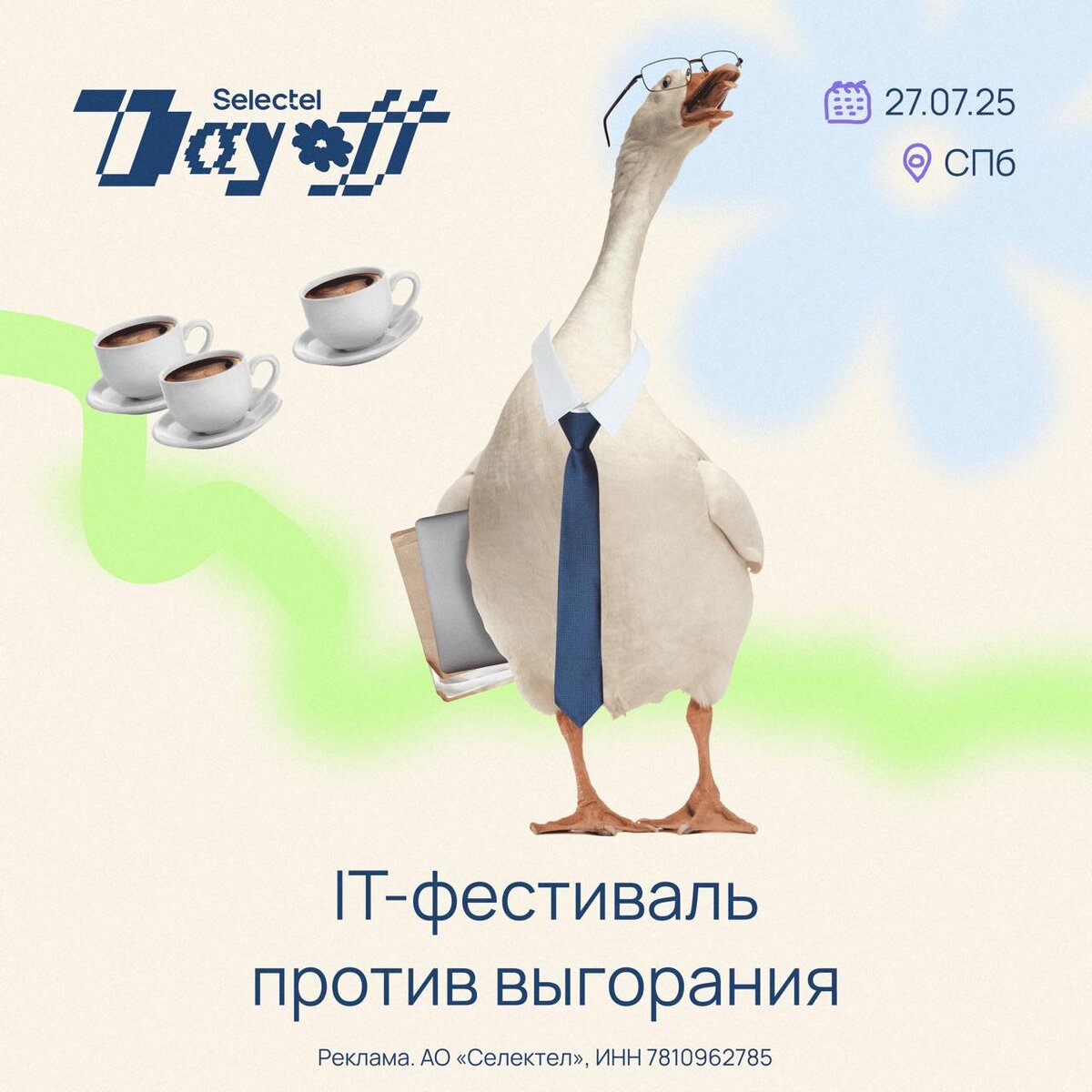На картинке — рабочий календарь, но если вы видите уставшего гуся, значит пора отдохнуть! Selectel организует атмосферный летний IT-фестиваль против выгорания! 🗓 27 июля 📍 Флагшток, Санкт-Петербург или онлайн В программе: ◽️доклады и воркшопы о том, как успевать работать и наслаждаться жизнью; ◽️открытый микрофон и IT-стендап; ◽️12 зон с разными хобби — от кастома вещей до рыбалки — чтобы попробовать все и выбрать свое. Бросайте все и приходите на фестиваль, чтобы найти баланс между работой и насыщенной жизнью. Регистрация и детали здесь: https://slc.tl/jo88c А чтобы узнать, при чем тут гусь, и другие секреты мероприятия, подписывайтесь на @Selectel_Events. Там же будет розыгрыш лимитированного тирекса!
