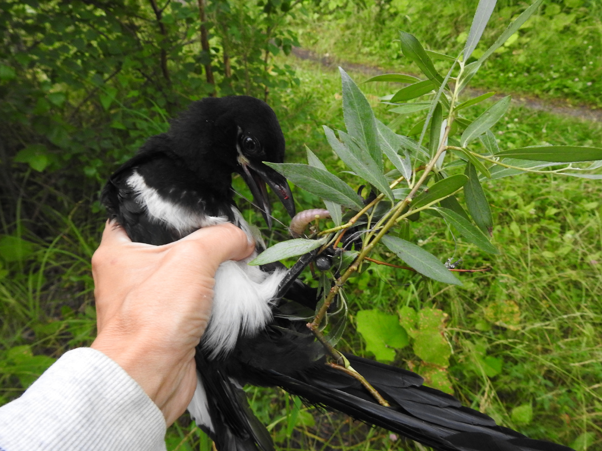 В воскресенье первый раз после болезни выбралась на прогулку, поехали на озеро Шарташ, там комаров поменьше. Прогулка была запланирована короткой, минут на 30-40, на первый-то раз. Но жизнь внесла свои коррективы. Пришлось проводить спасательную операцию по вызволению сорочонка, который запутался лапами в проволоке с грузилом и искусственной наживкой в виде жирной гусеницы. При этом проволока опутала ветку ивы, которая была тонкой и склонялась, но была высоко над водой. Сорочонок был вполне боец, активно рвался и хлопал крыльями, боролся за жизнь. Знаю, что некоторые скажут, что мы лишили хорошего обеда ворон и чаек, природа жестока, но нефиг с ней спорить. Но, каюсь, я мысли о медленном умирании этого юного существа вынести не могла. Муж снял кроссовки, полез в воду и, балансируя на маленьком камне, как-то смог палкой притянуть вниз ветку и оборвать ветку с сорочонком. Дальше у меня в руках оказался птиц с очень сложносочиненно опутанной тонкой проволокой лапками и шеей. Проволока с