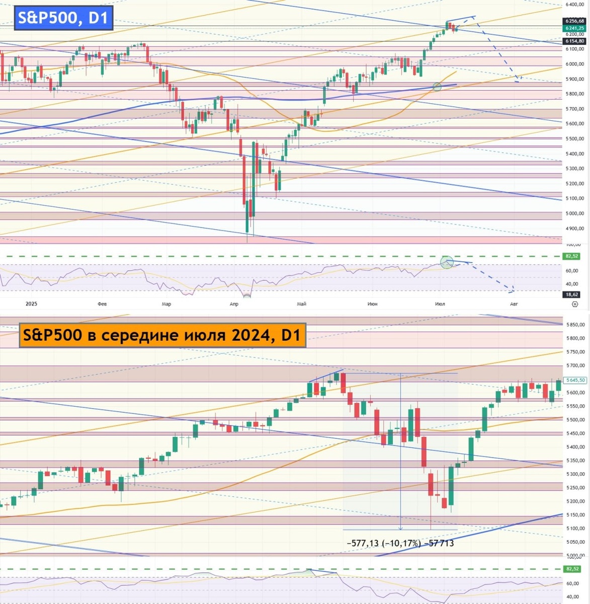☝🏻С технической точки зрения мы достигли максимальной перекупленности по индикатору RSI с 15 июля 2024 года. Год назад мы так же имели похожую картину - индекс был на историческом максимуме и достиг перекупленности, затем отрисовал дивергенцию и ушел в коррекцию на 10%.