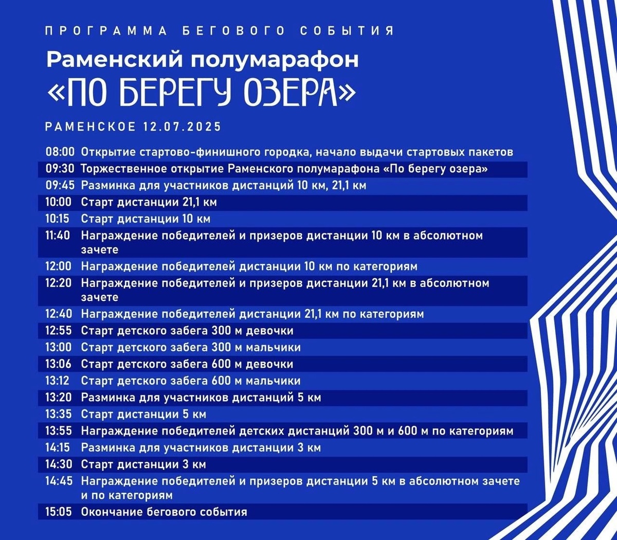 ✨ РАМЕНСКИЙ ПОЛУМАРАФОН «ПО БЕРЕГУ ОЗЕРА» 📆 12 июля состоится третий старт Суперлиги Подмосковья – это будет незабываемый забег с потрясающими видами и крутой атмосферой. 💪 Изучайте программу, планируйте свои тренировки и готовьтесь к забегу: runningmr.ru/ 🟦 Выбирайте свою дистанцию: • 300 м и 600 м (детские забеги) - дополнительная регистрация 4 июля, не пропустите! • 3 км – отлично для новичков • 5 км и 10 км – для тех, кто любит вызов • 21,1 км – настоящий полумарафон для самых выносливых. 📍Московская область, г. Раменское, Стадион «Сатурн» Подробная информация о серии забегов «Суперлиги Подмосковья» доступна на сайте - суперлигамо.рф. ⭐Разместить публикацию ⭐Поддержать голосом ✅ Спортивный Чехов https://dzen.ru/id/66f02564335c7475d84fbf87 http://vk.com/chehov_sport http://dzen.ru/chehov_sport