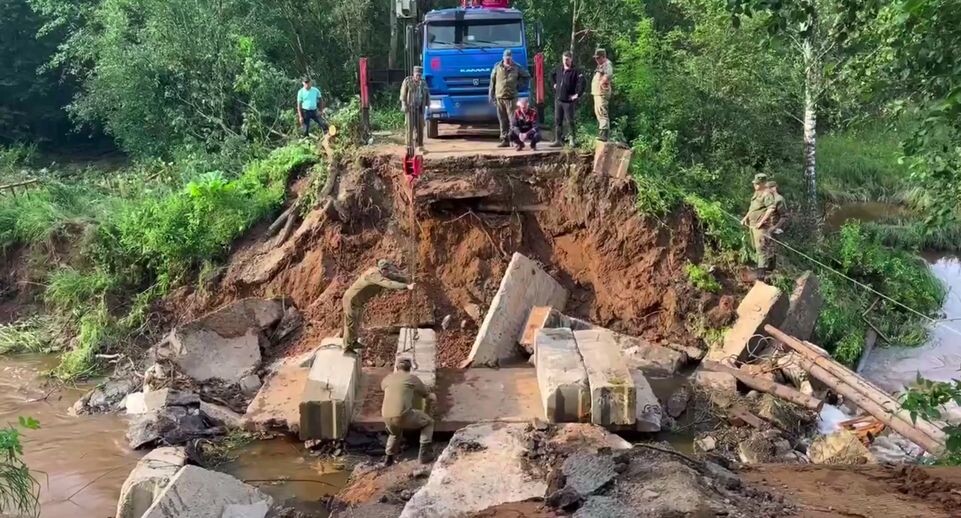 Первый пролет моста, размытого ливнем накануне, смонтировали вблизи деревни Сысоево под Истрой. Следом приступят к установке второго — уже с другой стороны дороги.