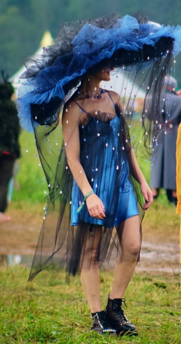 Делала еще в октябре, а надела вот в прошедшую субботу на карнавал Бессонницы (фест такой). Картон, малярный скотч, фатин, бусины. Общая стоимость 4 к. + винишко, временные затраты - 3 недели по вечерам. Половинки картона армировала палочками для садовых растений. Вот в такой обстановке прикрепила нитками и малярным скотчем верхушку. Всю обмотала скотчем и задрапировала черным ситцем. И начала пришивать фатин. На этом этапе было много переделок: то слишком много волн, то слишком мало. Фото есть только варианта "слишком много". По всей окружности пришила бусины-капли на леске и при дефиле по комнате стало ясно, что дождинки нещадно путаются между собой. Поэтому была пришита вуаль из фатина и дождинки пришиты уже к ней. Шляпа обрела окончательный вид и отправилась на лоджию ждать, а я занялась костюмом Солнышка для подруги. И вот наконец, ура, карнавал! И пошел дождь! И картон намок. И постоянные зацепки за идущих рядом. И в итоге поля шляпы заломились вниз. В общем, минута славы и на по