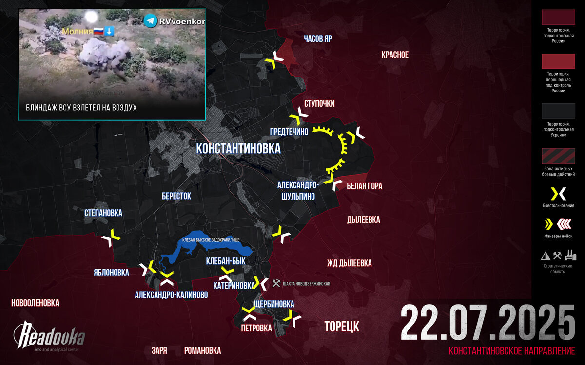 Редакция Readovka собрала самые важные события 22 июля в разрезе СВО. Русские войска овладели Белой Горой на Константиновском направлении, готовится дальнейшая атака на Предтечино и Александро-Шультино. Украинские Telegram-СМИ забили тревогу по факту прорыва русских подразделений в Покровск.. Бутылочное горло Русская армия добилась успеха в районе села Белая Гора на восточном секторе Константиновского направления. Неприятель оставил населенный пункт и отступил в Александро-Шультино. Особое внимание стоит обратить на то, что, несмотря на все угрозы, ВСУ пока не покидают позиции по западному берегу канала Северский Донец – Донбасс. А угрозы для противника там весьма высоки, ведь направление потенциального отхода к Константиновке прикрывается двумя «ребрами жесткости». На севере это Предтечино, на юге – Александро-Шультино. В случае, если одно из них выбудет из системы обороны ВСУ, «бутылочное горло» захлопнется. В чем же может быть причина упорства неприятеля на данном участке? Стоит усо