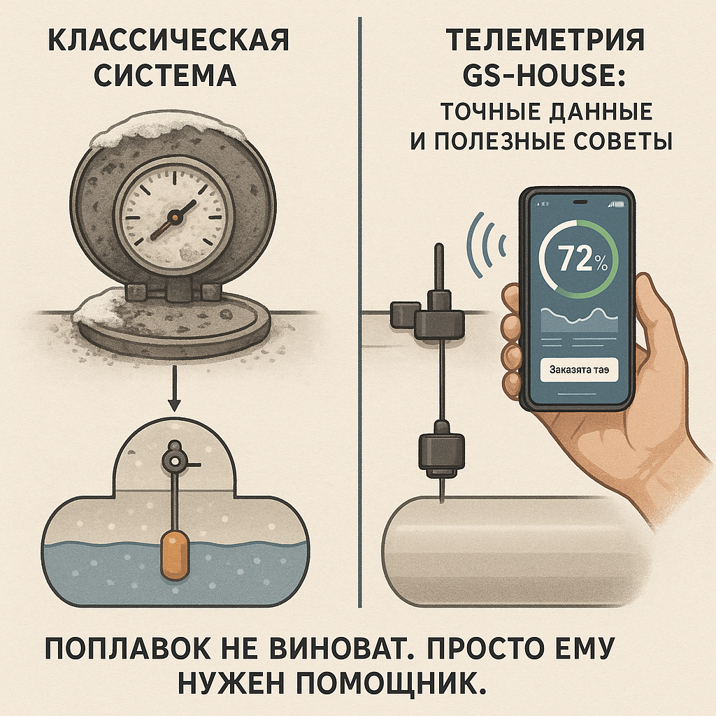 У каждого газгольдера с завода установлена простая, но надёжная система контроля уровня газа — поплавок и стрелочный индикатор. Работает это всё по старому доброму принципу: поплавок плавает на границе жидкой фазы пропана и через магнит и датчик Холла передаёт данные на шкалу. Уровень показывается в процентах, чаще всего — от 0 до 95%. На первый взгляд — удобно. Не требует электричества, не ломается, не надо обновлять прошивку. Но стоит пожить с газгольдером хотя бы одну зиму, чтобы понять: этой информации не хватает. Во-первых, индикатор установлен прямо на люке. Зимой он может быть под сугробом, осенью — в грязи. Во-вторых, он не шлёт вам push-уведомление, когда уровень падает до критического. А в-третьих — нет истории потребления, непонятно, какой расход и как часто нужно заказывать газ. Поплавок не виноват. Он честно показывает, что видит. Но он не видит ни погоды, ни вас, ни вашего котла, который решил пожечь побольше. Если хочется превратить газгольдер в умного помощника, стоит п
