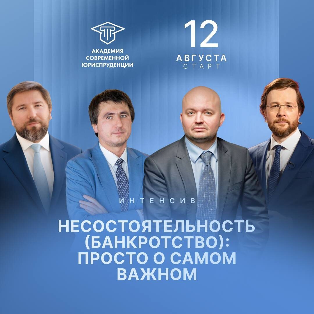 Уважаемые коллеги! Приглашаю Вас на долгожданный Интенсив: "НЕСОСТОЯТЕЛЬНОСТЬ (БАНКРОТСТВО): ПРОСТО О САМОМ ВАЖНОМ"🥳 Интенсив: 1️⃣ сформирует систему знаний в сфере банкротства; 2️⃣ обучит юридическим тонкостям сложной процедуры банкротства простым языком; 3️⃣ покажет ответы на актуальные вопросы, с которыми встречаются участники процедуры банкротства. Вас ждут невероятные спикеры: ⭐Шайдуллин Айнур Ильшатович (к.ю.н., доцент факультета права НИУ ВШЭ); ⭐Зайцев Олег Романович (к.ю.н., руководитель сектора банкротного права РШЧП, Председатель Банкротного Клуба, вошел в ТОП-100 самых влиятельных персон в банкротстве 2024 по версии портала PROбанкротство); ⭐Мифтахутдинов Рустем Тимурович (к.ю.н. Член наблюдательного совета Фонда содействия реструктуризации долга, Арбитр Российского Арбитражного центра при Институте современного арбитража); ⭐Бевзенко Роман Сергеевич (доктор юридических наук, эксперт в области гражданского права, правового регулирования оборота недвижимости, права ценных