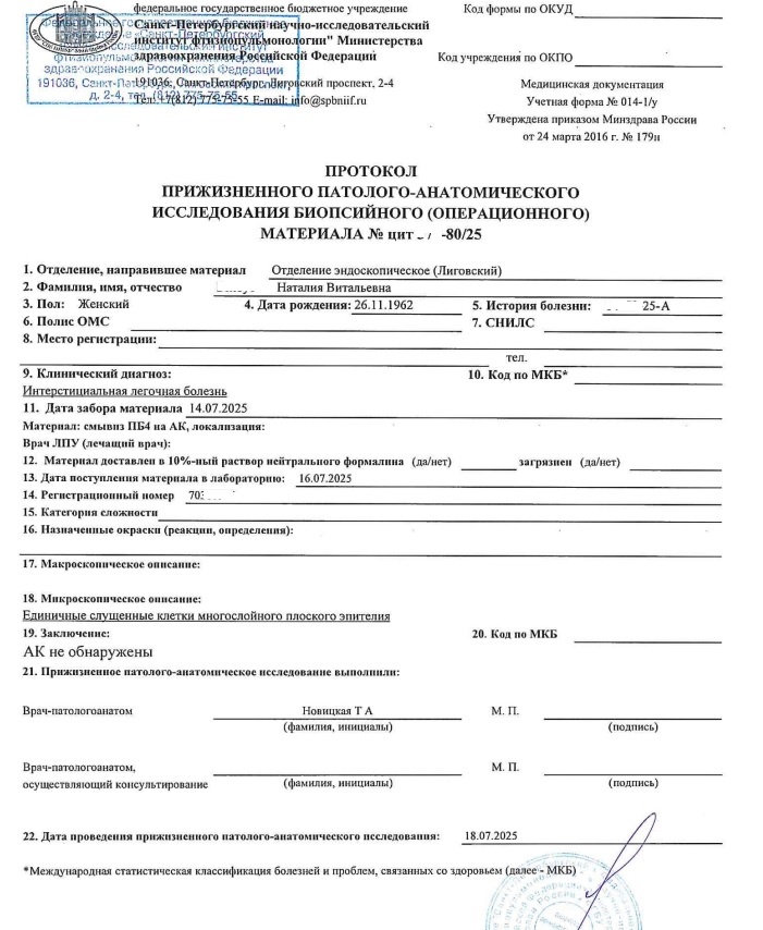 Хотя мне часто говорят - куда ты лезешь? Врачи столько лет учились, это профессионалы. Да, согласна. Но многие из них выгорают. Особенно онкологи. Да и не для кого не секрет, что часто встречаются врачи, работающие "на отвались". Именно такая попалась мне при диагностике рака гортани. Если бы не растили опухоль 4 месяца, не понадобилась бы столь высокодозная химия. И не разваливался бы мой организм сейчас. Теперь я выбираю врачей очень тщательно. По крайней мере во всем, что касается онкологии. Но от ошибок никто не застрахован. Как говорится : "Лучше перебдеть..." Сегодня получила результаты цитологии из бронхиальных смывов Атипичные клетки не обнаружены Чувствительность цитологического метода для диагностики опухолей легкого составляет от 89,9 до 92,5% (в зависимости от гистологической формы данный показатель несколько отличается), а специфичность – до 97,8%. Хотя врачи утверждают, что в моей ситуации все не так однозначно. Дальше разбираться пока не стала. Завтра выясню подробности.