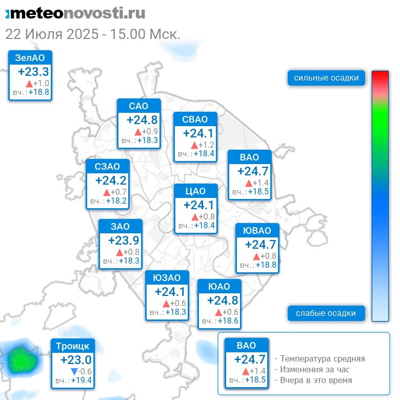 В 15:00 в Москве было от +22.5°C до +26.1°C, средняя температура +24.3°C #погода #Москва #лето #температура #22июля #вторник