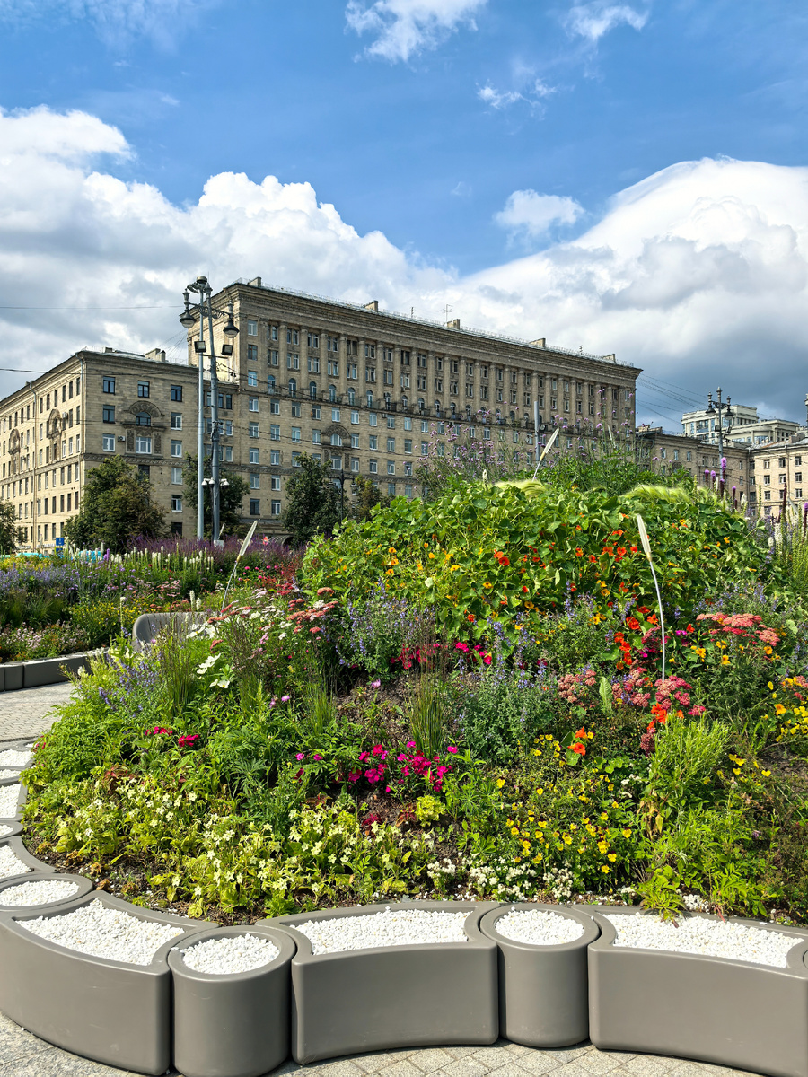 Прямо на гигантской Московской площади, рядом с монументальным Домом Советов, расположился удивительный объект - Сад-трансформер. Это не просто зеленый уголок, а настоящая инновация в городском озеленении! 🌱