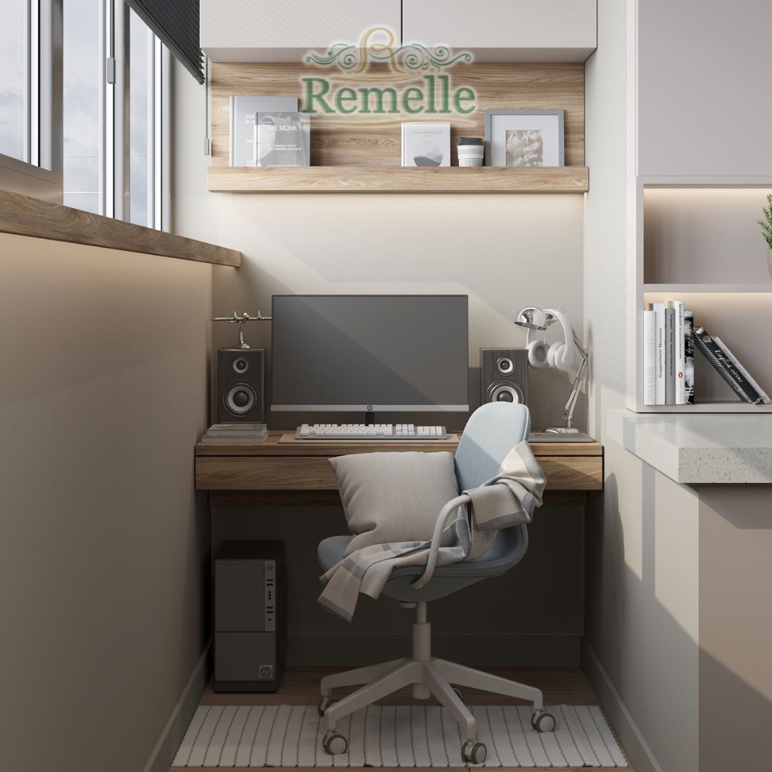 Освещение играет ключевую роль в продуктивности. Лучше всего комбинировать естественный свет и искусственный: днем можно работать при дневном освещении, а вечером использовать настольную лампу с теплым или нейтральным светом. Если окна выходят на солнечную сторону, стоит предусмотреть жалюзи или плотные шторы, чтобы избежать бликов на мониторе. Выбор мебели зависит от размеров лоджии. Оптимальный вариант – компактный прямой стол, который поместится даже в узком пространстве (мы использовали такой для компьютера). Если места совсем мало, можно