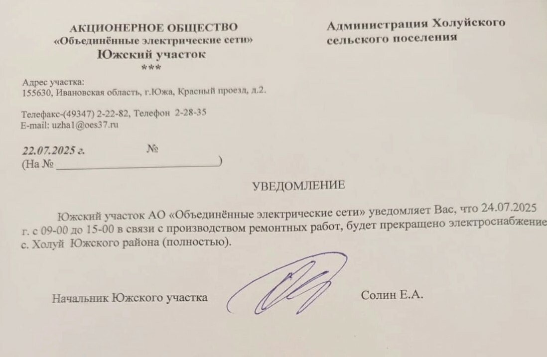 На 6 часов полностью отключат электричество в Холуе 24 июля в селе Холуй Южского района с 9 до 15 часов будет полностью отключено электроснабжение. АО «Объединенные электрические сети планируют проведение ремонтных работ. Фото: Услышано | Холуй // ВКонтакте