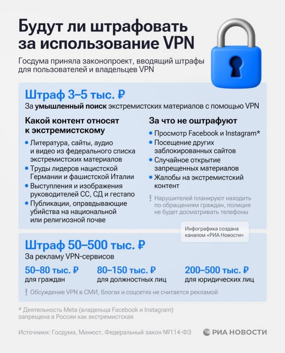 ⚡ Госдума в третьем чтении приняла закон о штрафах за поиск экстремистских материалов и рекламу VPN-сервисов: - За поиск экстремистского контента — до 5 тысяч рублей. - За рекламу VPN — до ₽500 тыс. - За передачу SIM-карты — до ₽50 тыс. - За передачу логинов и паролей от интернет-аккаунтов — до ₽200 тыс. Закон вступает в силу с 1 сентября 2025 года.