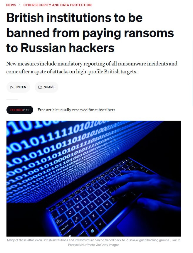 Британское правительство запретит «критически важным» учреждениям платить выкупы российским хакерам. Об этом сообщил министр по безопасности Дэн Джарвис. На самом деле, объявленный запрет касается любых хакеров, однако Politico предпочло указать в заголовке именно русских. Потому что именно они якобы ответственны за «многие» хакерские атаки. Кошка бросила котят... 👍 БайБайден. Подписаться