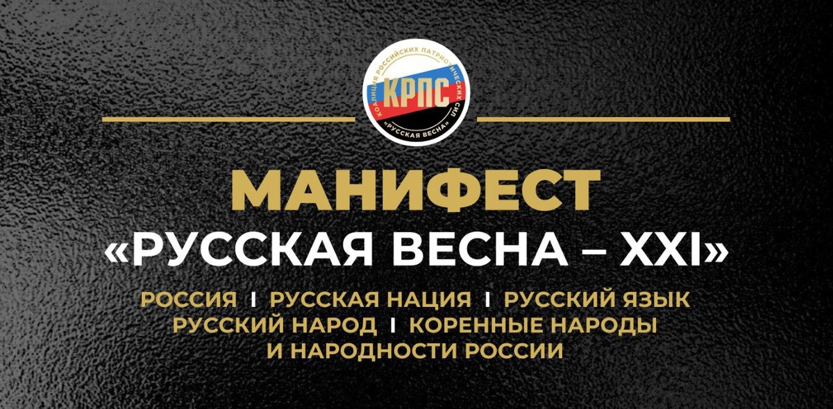МАНИФЕСТ «РУССКАЯ ВЕСНА - XXI» (часть №1) 1. РОССИЯ является Единым Государством Русской Нации на территории Евразии от Атлантического до Тихого океана. 2. РУССКАЯ НАЦИЯ представляет собой совокупность граждан Государства Российского, обладающих чувством общей истории, общего культурного наследия, общими духовно-нравственными ценностями, соотносящих себя со своей страной, ее настоящим, прошлым, будущим и свободно владеющих Русским Языком. 3. РУССКИЙ ЯЗЫК является единственным государственным языком на территории Российского Государства. Русский Язык возник благодаря пастырскому служению Русской Церкви, создал могучее государство и великую культуру, объединил многочисленные племена и сообщества в Великий Русский Народ. 4. РУССКИЙ НАРОД, чьи предки тысячелетиями постоянно проживали на обширной территории Восточно-Европейской равнины, является носителем Русского Языка в мире, основой Русской Нации и защитником Русской Церкви. Говоришь по-русски, думаешь по-русски, имеешь русских пре