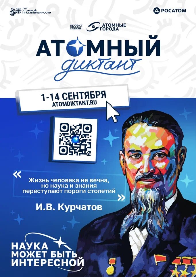 В этом году атомная отрасль России отмечает грандиозный юбилей — 80 лет. Восемь десятилетий знаний, смелых экспериментов и инженерной дерзости, благодаря которым когда-то невозможное стало реальностью: от мирного атома в энергетике до прорывов в медицине и электромобильности. В этом году юбилей также отмечают Союз «Атомные города» и международный просветительский проект «Атомный диктант». Вот уже пять лет проект доказывает: атомная отрасль – удивительный мир, полный невероятных свершений, гордости за свою страну и технологий будущего. И в особенный год Союз приготовил для участников проекта еще больше интересных вопросов, ценных подарков и приятных сюрпризов. В чём миссия «Атомного диктанта»? Для большинства людей атомная отрасль — нечто далёкое и загадочное. Десятилетиями атомная энергетика и наука оставались «закрытой» темой. Но сегодня российская атомная отрасль — это: Все эти темы отражает «Атомный диктант» — проект, который делает науку ближе каждому. Он позволяет глубже погрузит