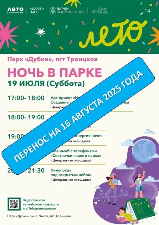 ✨ Из-за погодных условий Фестиваль 🌜 НОЧЬ В ПАРКЕ в 🌳 Парке «Дубки» (с. Троицкое) перенесен на 16 августа 2025 ✍️Программу мероприятия опубликуем ближе к дате проведения. 🚫 Возраст: 0+ 📆 16.08.2025 🏢 Парк культуры и отдыха «Дубки» 📍 г.о.Чехов, с.Троицкое, парк "Дубки" 🪙 Вход свободный❗️ ⭐Разместить публикацию ⭐Поддержать канал голосом 💰 Стань курьером в Чехове – твой доход, твое время! ✅ Мероприятия Чехов https://dzen.ru/id/66cc4b48e9ef144699238a51 http://vk.com/chekhov_events http://dzen.ru/chekhov_events