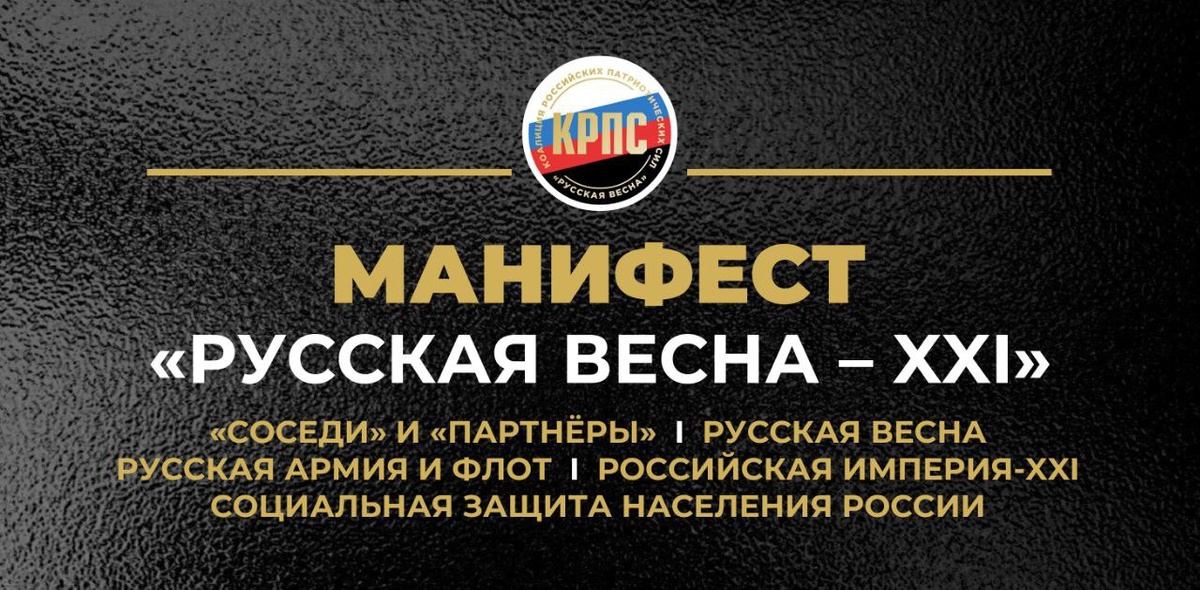 МАНИФЕСТ «РУССКАЯ ВЕСНА - XXI» (часть №2) 6. «СОСЕДИ» И «ПАРТНЕРЫ» – это советские национальные республики, выпестованные и выращенные руководством СССР за счет Русского народа, США, Евросоюз и их саттелиты, которые, уже не маскируясь, в открытую декларируют свои намерения по захвату и дальнейшему расчленению нашей территории и ПОЛНОМУ УНИЧТОЖЕНИЮ НАС КАК РУССКИХ И КАК ХРИСТИАН. 7. РУССКАЯ ВЕСНА - геополитический процесс русской национальной Ирреденты, начавшийся в 2014 году, последовательные действия во времени и пространстве, направленные на достижение воссоединения, процветания и обеспечения дальнейшего существования Русского Народа, естественная реакция нации на постоянные попытки ее унижения и уничтожения. Поэтому для защиты своих земли, языка, веры, национальных интересов, соотечественников и друзей за рубежом нам необходимы полноценные Русская Армия и Флот. 8. РУССКАЯ АРМИЯ И ФЛОТ - это реформированные, высокопрофессиональные, кадровые, полностью боеготовые Вооруженные С