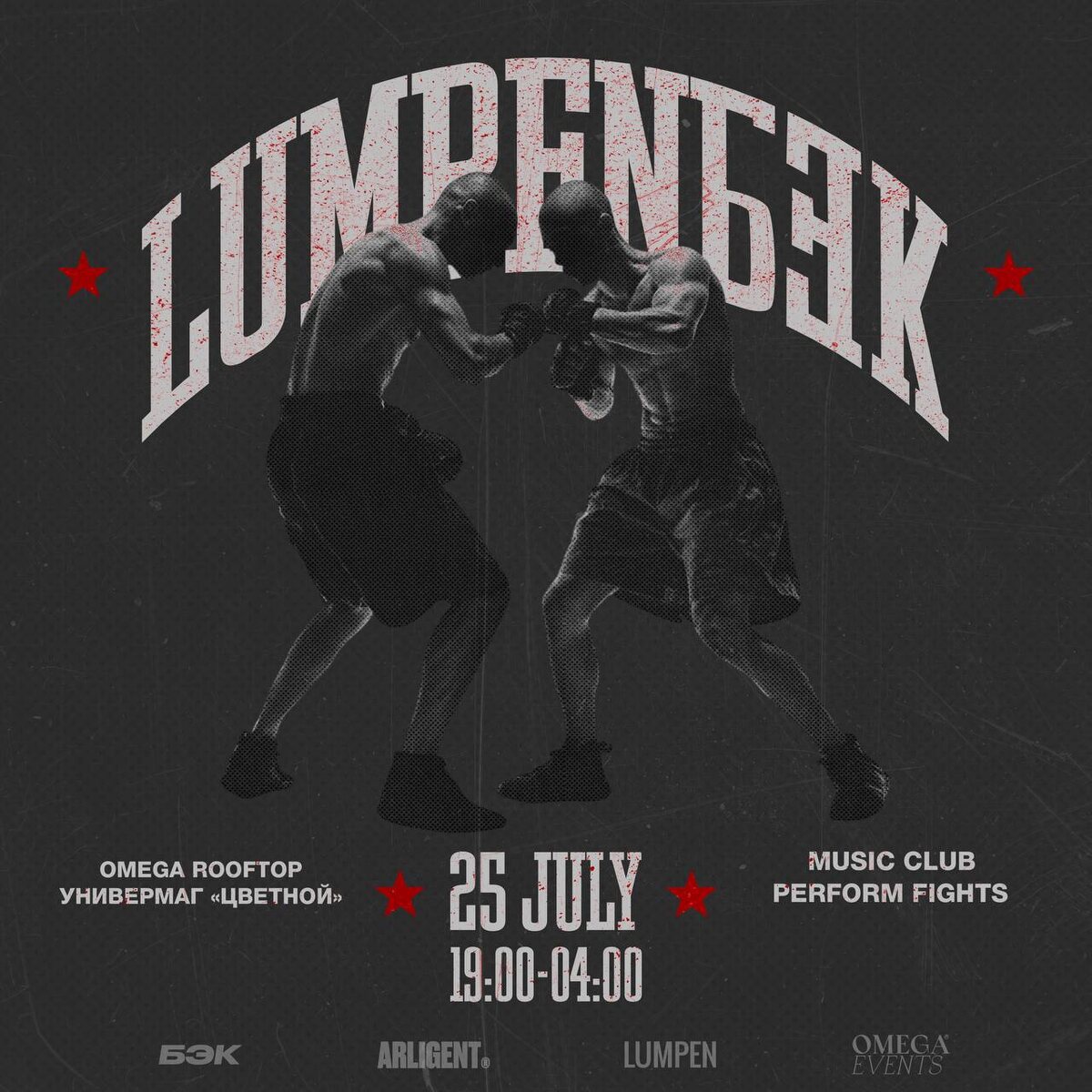 ⭐️ LUMPENБЭК ⭐️ 25 JULY Одна ночь. Две силы. Три имени. Ивент агентство БЭК и модельное агентство LUMPEN в сотрудничестве с фэшн-брендом ARLIGENT объединяются в симбиоз моды, борьбы и ритма. ⠀ I действие : Перформанс бои. 20 моделей выходят на ринг не ради золота и титулов, а за то, что не измеряется: внимание, контракты, статус и стиль. Бои проходят под dj-сэты в жанре хард-грув и техно, а за пультом - те же, кто и и на ринге. ⠀ Это визуальный манифест индустрии, где слабых не держат. Вместо подиума — ринг на крыше Цветного. II действие : Музыкальный клуб. Доминирующий красивый хаус, жаркие танцы и пространство, напоминающее клубы Нью-Йорка, двухуровневый с широкими фотогеничными лестницами напротив танцпола. ⠀ Локация — Omega Rooftop Универмага «Цветной», одна из самых закрытых и недоступных точек города, теперь открытая на одну ночь. Панорамный вид на вечернюю Москву, француский стиль - вход с жестким FC/DC 18+ и подъем только через лифт. Вход по пригласительным или билетам. По