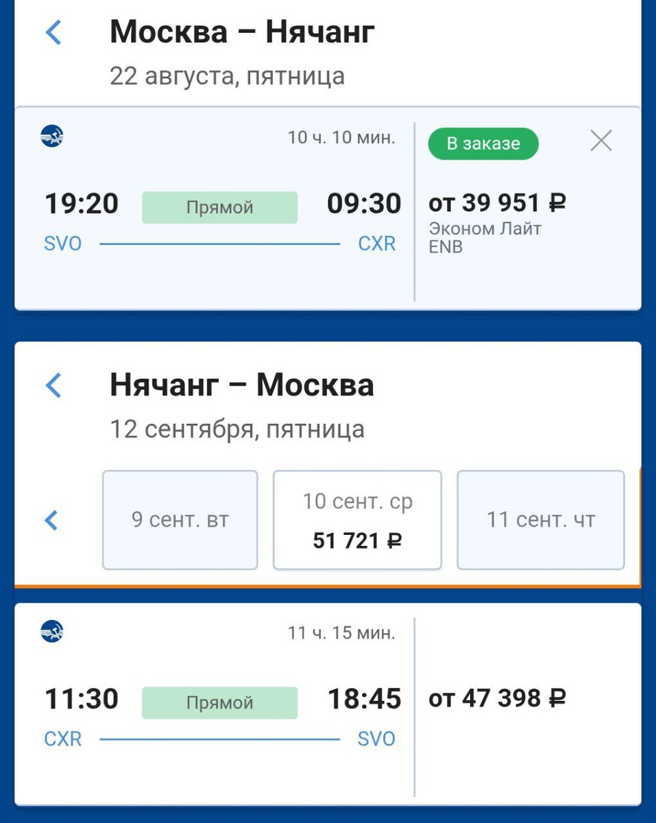 Программа полетов "Аэрофлота" из Москвы в Нячанг постепенно становится ежедневной "Аэрофлот" планомерно увеличивает частоту полетов из Москвы (Шереметьево) на популярный вьетнамский курорт Нячанг. ➡️Расписание будет меняться так: 🔵Сейчас: выполняется 4 рейса в неделю (вт, чт, сб, вс). С 15 августа добавится рейс по пятницам, то есть станет 5 рейсов в неделю. 🔵С 22 сентября добавится еще рейс по понедельникам - количество вырастет до 6 рейсов/неделю. 🔵С 1 октября появится еще один рейс по средам. Таким образом, полеты станут ежедневными. ➡️Стоимость перелёта в августе – от 40 тыс. руб. в одну сторону и от 87,3 тыс. руб. туда-обратно без багажа. "Аэрофлот" также выполняет рейсы в Хошимин по средам и пятницам. @atorus