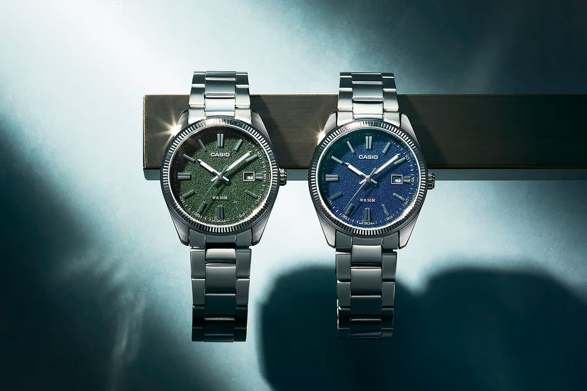 Еще одно яркое обновление получила серия MTP-1302 в июле 2025. Представителей MTP-1302 можно назвать одними из самых популярными в категории недорогих стрелочников в латунном хромированном корпусе и со стальным браслетом. Из-за своего консервативного внешнего вида, минимализма и сходства с люксовым сегментом (намекаем на ROLEX), MTP-1302 просто “рвут” продажи, особенно в офлайн магазинах. Не осуждаем, а одобряем)). Кто не хочет себе классического стильного представителя за 75$-100$ прогуливаясь торговым центром? Так вот, японцы показали аж целых пять новых цветовых решений любимого корпуса, четыре из которых могут похвастаться матовым циферблатом с дополнительной текстурой. Вы только посмотрите на эту красоту! Аж не верится, что перед нами в целом очень недорогие часики, но такие красивые! В отличие от цвета “Tiffany Blue” (кстати, вот наш обзор: MTP-1302PD-2A2V “Tiffany Blue” — старые формы в популярном цвете), сегодняшние матовые герои удивляют “песчаной” поверхностью. Напомним, MTP-